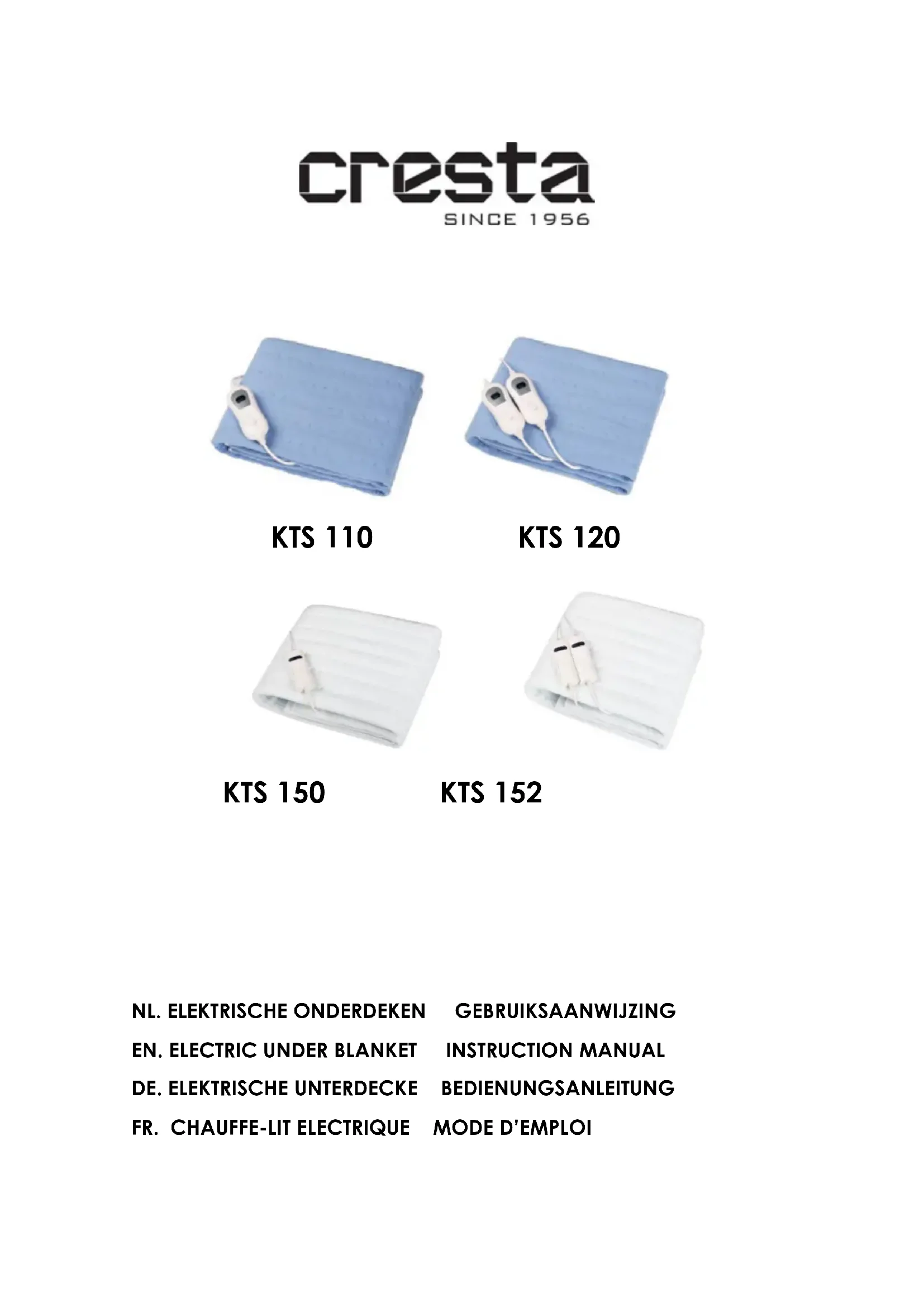 Nous vous félicitons d'avoir achetié un de nos chauffe-lits électriques CRESTA KTS 110, KTS 120, KTS 150 ou KTS 152 et nous vous remercions pour la confiance que vous accordez aux produits de notre marque. Nous sommes convaçus qu'avoc cet achat, vous avez acquis un produit de qualité qui vous sera utilependant de longues années.