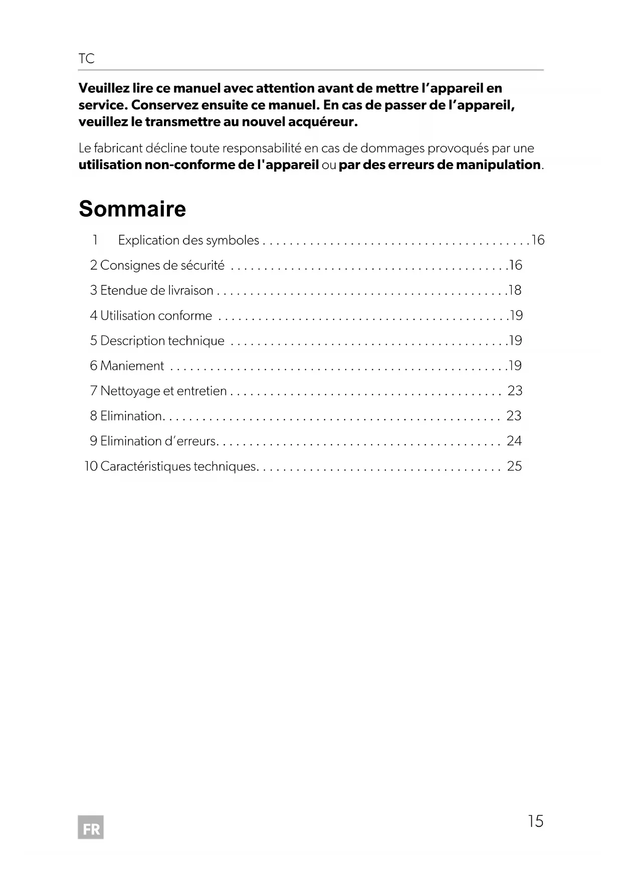 - Veuillez lire ce manuel avec attention avant de mettre l’appareil en service. Conservez ensuite ce manuel. En cas de passer de l’appareil, veuillez le transmettre au nouvel acquéreur. Le fabricant décline toute responsabilité en cas de dommages provoqués par une utilisation non-conforme de l'appareil ou par des erreurs de manipulation. Sommaire 1 Explication des symboles p. 16