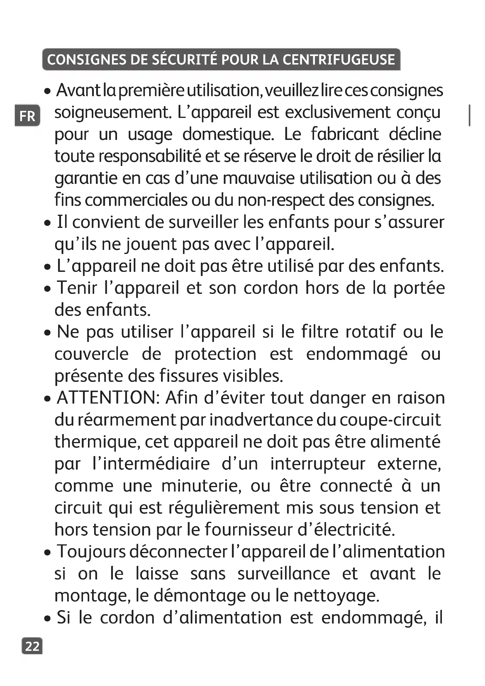 - Ne pas utiliser l'appareil si le filtre rotatif ou le couvercle de protection est endommagé ou présente des fissures visibles.