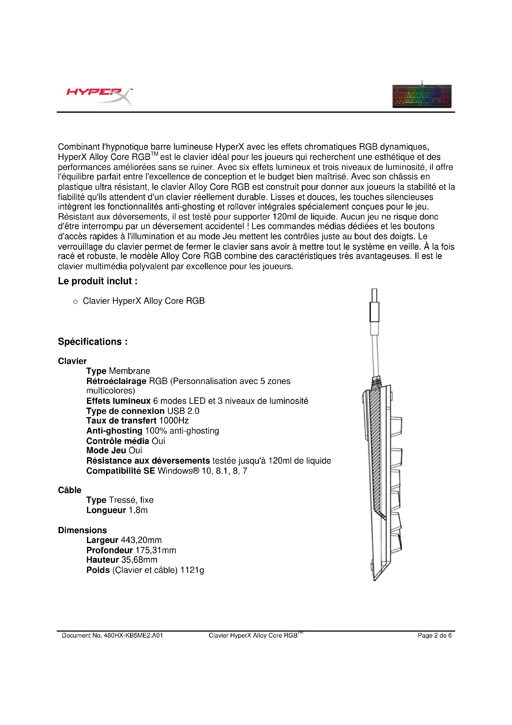 est le clavier idéal pour les joueurs qui recherchent une esthétique et des performances améliorées sans se ruiner. Avec six effets lumineux et trois niveaux de luminosité, il offre l'équilibre parfait entre l'excellence de conception et le budget bien maîtrisé. Avec son châssis en plastique ultra résistant, le clavier Alloy Core RGB est construit pour donner aux joueurs la stabilité et la fiabilité qu'ils attendent d'un clavier réellement durable. Lisses et douces, les touches silencieuses intègrent les fonctionnalités anti-ghosting et rollover intégrales spécialement conçues pour le jeu. Résistant aux déversements, il est testé pour supporter 120ml de liquide. Aucun jeu ne risque donc d'être interrompu par un déversement accidentel ! Les commandes médias dédiées et les boutons d'accès rapides à l'illumination et au mode Jeu mettent les contrôles juste au bout des doigts. Le verrouillage du clavier permet de fermer le clavier sans avoir à mettre tout le système en veille. À la fois racé et robuste, le modèle Alloy Core RGB combine des caractéristiques très avantageuses. Il est le clavier multimédia polyvalent par excellence pour les joueurs.Document No. 480HX-KB5ME2.A01 Clavier HyperX Alloy Core RGB
