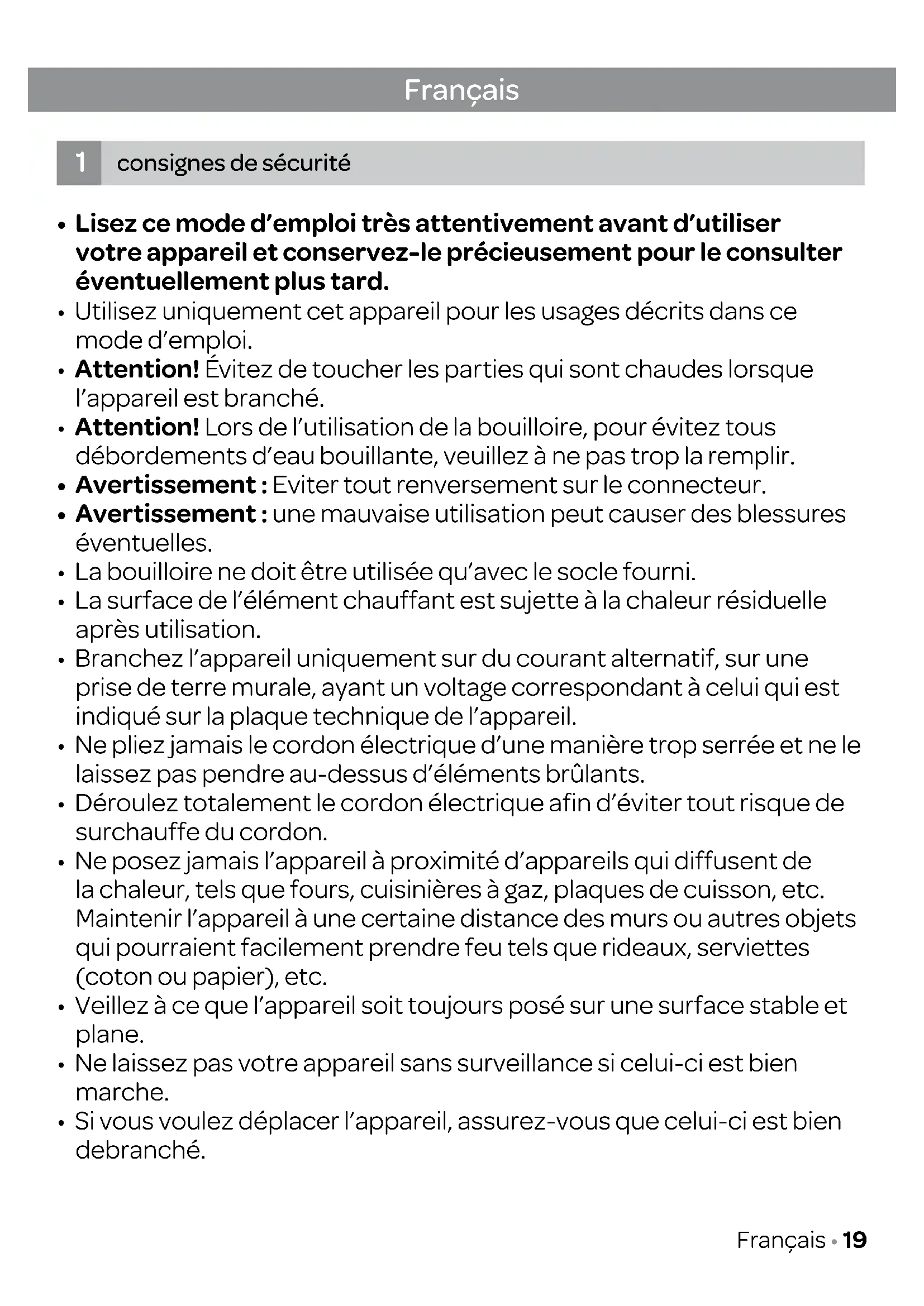 La bouilloire a ete conue quenment pour faire bouillir de I'eau. Ne la remplissez jamais avec du lait, du the ou du cafe, ni avec d'autres boissons instantanees.