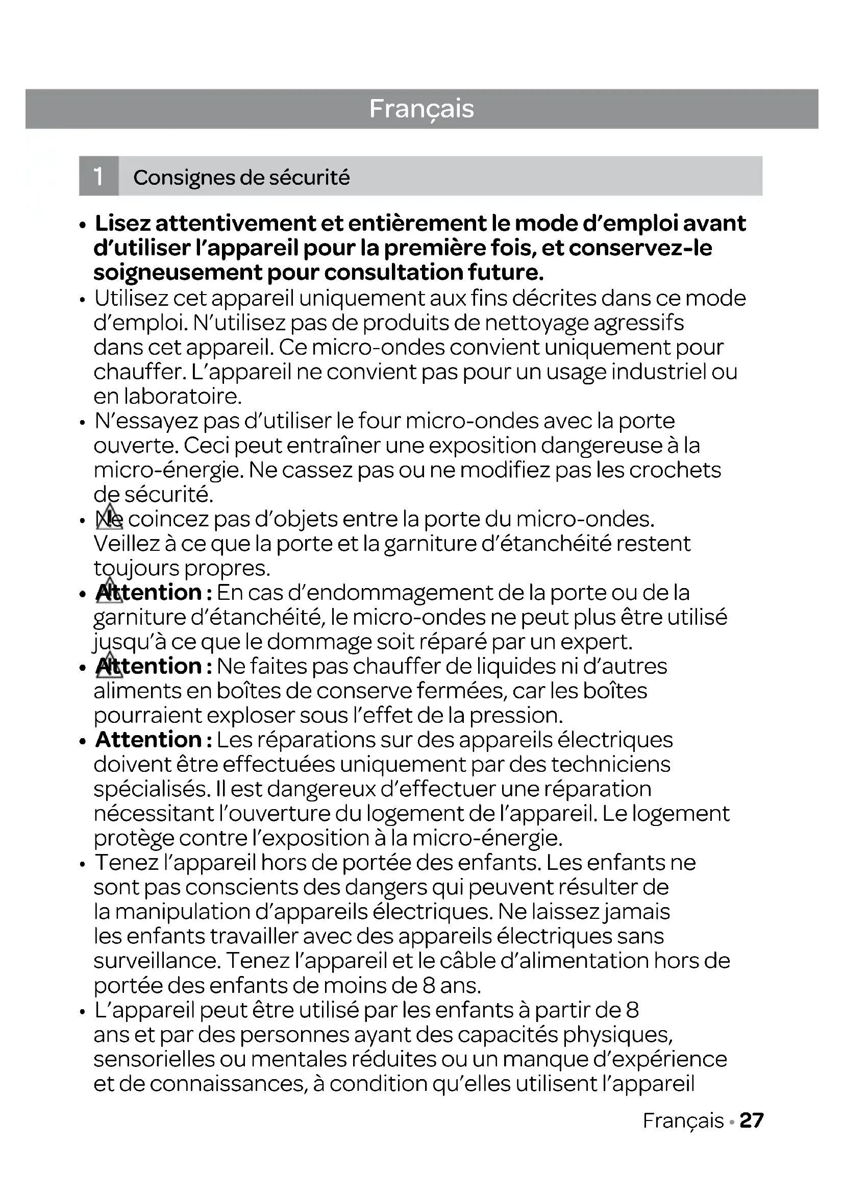 - Utilisez cet apparéil uniquement aux fins décrites dans ce mode d'emploi. N'utilisez pas de produits de nettoyage agressifs dans cet apparéil. Ce micro-ondes convient uniquement pour chauffer. L' apparéil ne convient pas pour un usage industriel ou en laboratoire.