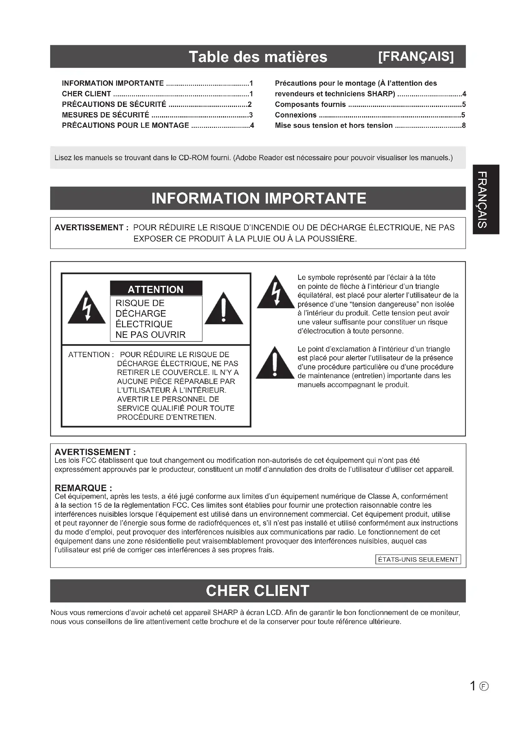 FRANÇAIS Nousvousremercionsd’avoirachetécetappareilSHARPàécranLCD.Andegarantirlebonfonctionnementdecemoniteur, nous vous conseillons de lire attentivement cette brochure et de la conserver pour toute référence ultérieure. CHER CLIENT INFORMATION IMPORTANTE
