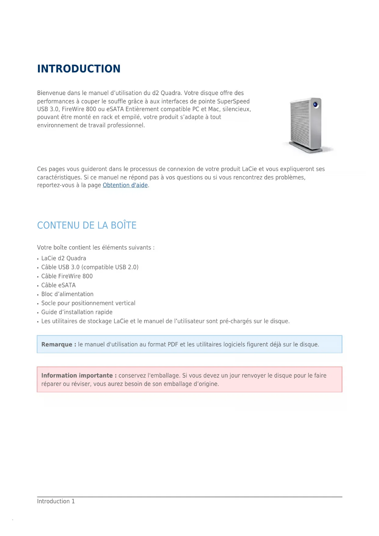 pl. 28036 Madrid info.es@lacie.com LaCie Switzerland Davidsbodenstrasse 15A 4004 Basel info.ch@lacie.com LaCie United Kingdom and Ireland LaCie Ltd, Power Road Studios 114 Power Road Chiswick, London, UK W4 5PY UK: info.uk@lacie.com Ireland: info.ie@lacie.com LaCie USA 22985 NW Evergreen Pkwy Hillsboro, OR 97124 sales@lacie.com LaCie Worldwide Export 17, rue Ampère 91349 Massy Cedex, France sales.intl@lacie.com support.intl@lacie.comIntroduction 1 INTRODUCTION Bienvenue dans le manuel d’utilisation du d2 Quadra. Votre disque offre des performances à couper le souffle grâce à aux interfaces de pointe SuperSpeed USB 3.0, FireWire 800 ou eSATA Entièrement compatible PC et Mac, silencieux, pouvant être monté en rack et empilé, votre produit s’adapte à tout environnement de travail professionnel. Ces pages vous guideront dans le processus de connexion de votre produit LaCie et vous expliqueront ses caractéristiques. Si ce manuel ne répond pas à vos questions ou si vous rencontrez des problèmes, reportez-vous à la page Obtention d'aide.