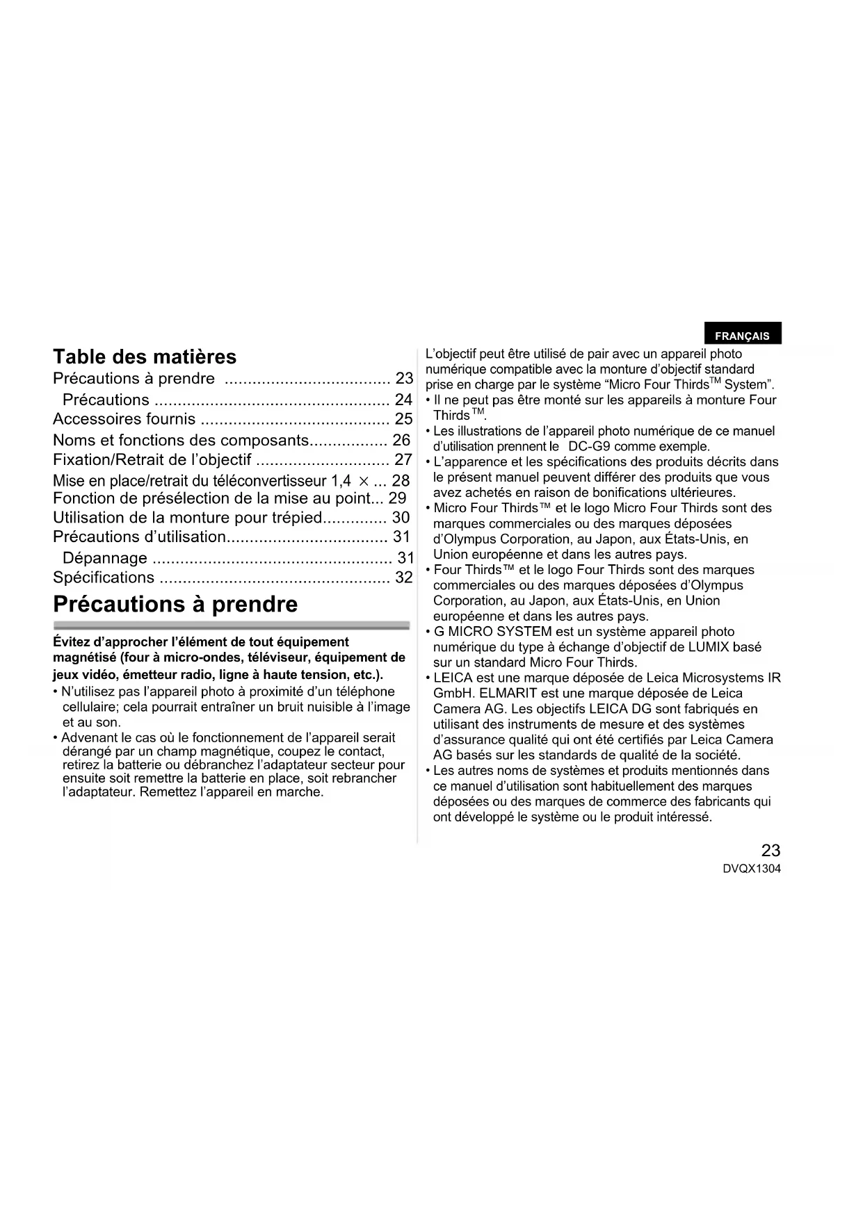 G MICRO SYSTEM est un système applicel photo numérique du type à échange d'objectif de LUMIX basé sur un standard Micro Four Thirds. - LEICA est une marque déposée de Leica Microsystems IR GmbH. ELMARIT est une marque déposée de Leica Camera AG. Les objectifs LEICA DG sont fabriqués en utilisant des instruments de mesure et des systèmes d'assurance qualité qui ont été certifiés par Leica Camera AG basés sur les standards de qualité de la société.