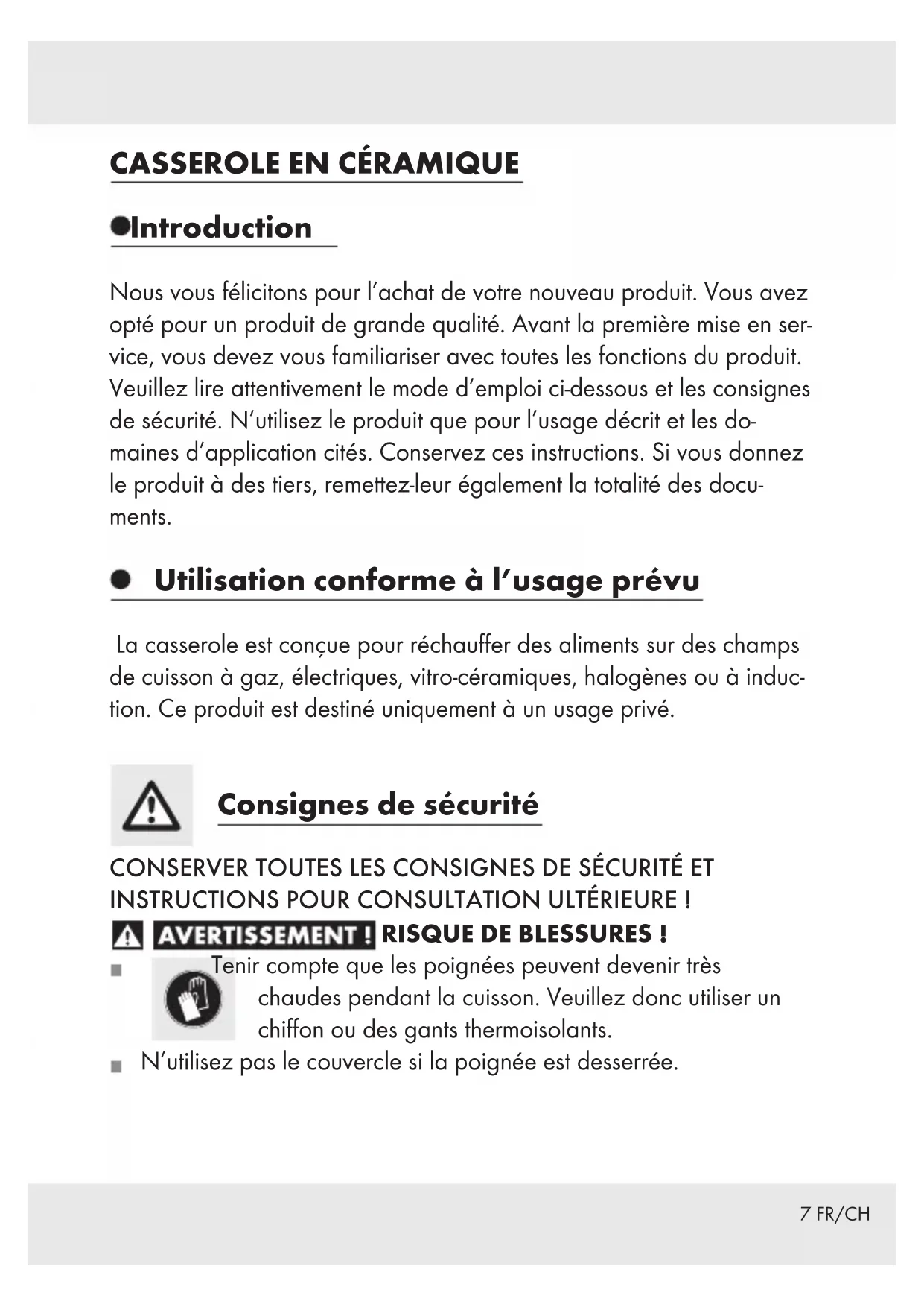 Introduction Nous vous félicitons pour l’achat de votre nouveau produit. Vous avez opté pour un produit de grande qualité. Avant la première mise en ser- vice, vous devez vous familiariser avec toutes les fonctions du produit. Veuillez lire attentivement le mode d’emploi ci-dessous et les consignes de sécurité. N’utilisez le produit que pour l’usage décrit et les do- maines d’application cités. Conservez ces instructions. Si vous donnez le produit à des tiers, remettez-leur également la totalité des docu- ments. Utilisation conforme à l’usage prévu La casserole est conçue pour réchauffer des aliments sur des champs de cuisson à gaz, électriques, vitro-céramiques, halogènes ou à induc- tion. Ce produit est destiné uniquement à un usage privé. Consignes de sécurité CONSERVER TOUTES LES CONSIGNES DE SÉCURITÉ ET INSTRUCTIONS POUR CONSULTATION ULTÉRIEURE ! RISQUE DE BLESSURES ! Tenir compte que les poignées peuvent devenir très chaudes pendant la cuisson. Veuillez donc utiliser un chiffon ou des gants thermoisolants. N’utilisez pas le couvercle si la poignée est desserrée.8 FR/CH RISQUE DE DÉGÂTS MATÉRIELS ! Il est essentiel de ne pas laisser les casseroles et poêles contenant de la graisse sans surveillance pendant la cuisson. La graisse peut chauffer et s’enflammer rapidement. Si la graisse s’enflamme, ne jamais tenter de l’éteindre avec de l’eau ! Étouffer les flammes avec le couvercle de la casserole ou une couverture épaisse en laine. Afin de ne pas endommager le revêtement antiadhésif, uniquement utiliser des ustensiles de cuisine en plastique ou en bois. Ne pas couper les aliments cuits directement dans la casserole. Ne pas déposer un morceau de viande dégoulinant dans de la graisse chaude. Les projections de graisse sur la plaque de cuisinière chaude peuvent aisément causer un incendie. Des températures élevées risquent de décolorer la partie exté- rieure du produit. Cette dose n’indique pas un défaut dans la ma- tière. Elle ne nuit pas non plus à la qualité et au fonctionnement du produit. Sélectionner une plaque de cuisson d’un diamètre correspondant à celui de la casserole pour éviter toute perte de chaleur. Cet article convient pour tenir des mets au chaud dans un four (max. 150 °C pendant 1 heure). Prière de ne jamais tenir le produit chaud sous l’eau courante froide. Le dessous du produit pourrait être ainsi endommagé ou tomber du produit. Le produit est lavable en lave-vaisselle. Un nettoyage fréquent du produit à l’aide de produits de net- toyage agressifs peut endommager celui-ci et en provoquer la dé- coloration. Le nettoyage dans le lave-vaisselle peut décolorer les pièces en aluminium. ATTENTION ! Le couvercle en verre est fragile / non résistant aux chocs !9 FR/CH Nettoyer la casserole à la main avec de l’eau chaude et un liquide vaisselle en vente dans le commerce. Proscrire l’utilisation de tout objet coupant et pointu afin de ne pas endommager le matériel. Ne tirez et ne poussez pas le produit sur les plaques de cuisson vitrocéramiques ou halogènes. La plaque de cuisson risque alors d’être rayée. Veuillez noter qu’en raison de la couleur claire un léger change- ment de celle-ci peut apparaître lors de l’utilisation de ce produit. Ces colorations sont considérées comme des traces d’utilisation et ne représentent aucune atteinte à la qualité du revêtement et à son utilité. Remarque relative aux cuisinières à induction J Remarque: un bruit peut se produire dans certaines conditions, causé par les propriétés électromagnétiques de la source de chaleur et de la marmite / casserole. J Il s’agit d’un phénomène tout à fait normal et n’indique nullement que votre cuisinière à induction ou votre batterie de cuisine est endommagée. J Placez la marmite / casserole au centre de la plaque chauffante à induction. J ATTENTION! Vitesse de chauffe élevée ! Ne chauffez pas excessivement la batterie de cuisine lors du préchauffage. J La pièce doit être bien aéré, en cas de surchauffe de la batterie de cuisine.10 FR/CH Usage Avant la première utilisation, veuillez décoller les éventuelles étiquettes adhésives et rincer l’article à l’eau chaude. Avant la première utilisation, faire chauffer la casserole 2 ou 3 fois avec de l’eau pour éliminer complètement tous éventuels résidus de fabrication. Ne pas surchauffer la casserole vide ou contenant des aliments, car cela réduirait la propriété antiadhésive et abîmerait la couche de protection. Recyclage L’emballage se compose de matières recyclables qui peuvent être mises au rebut dans les déchetteries locales. Les possibilités de recyclage des produits usés sont à demander auprès de votre municipalité.11 IT/CH