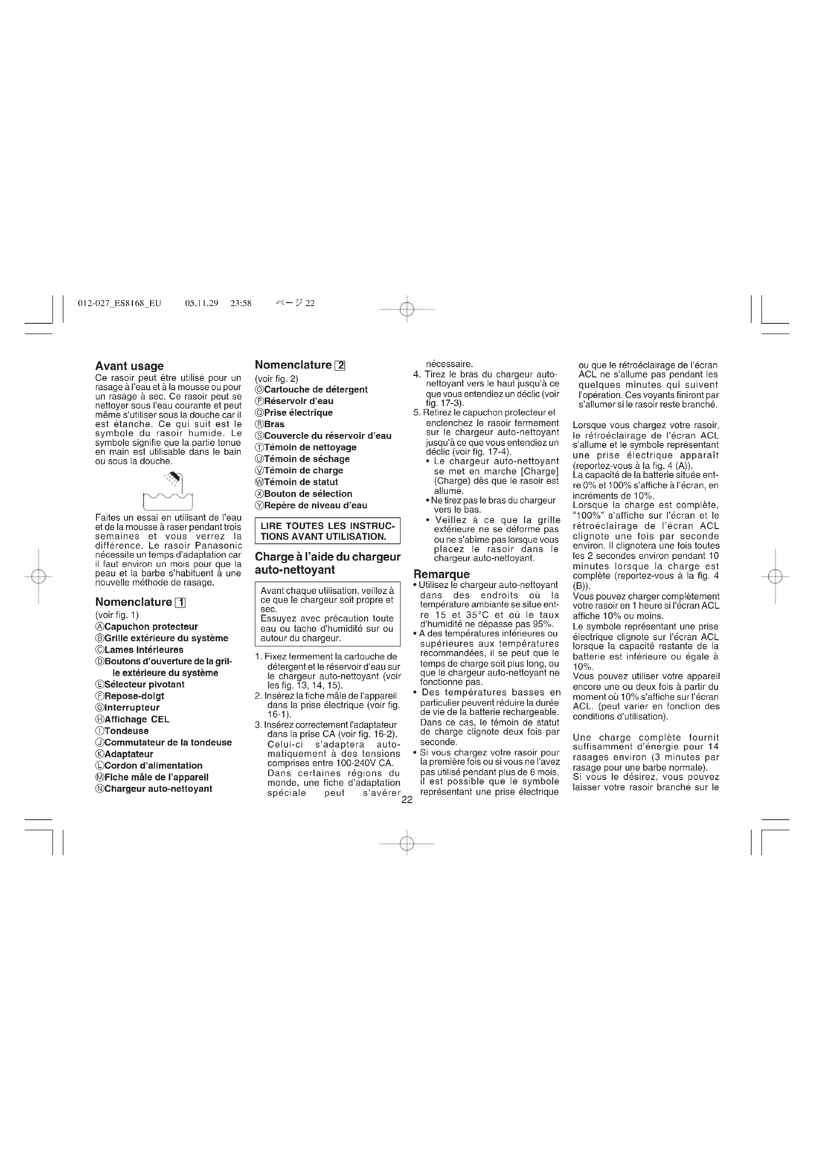 012-027ES8168EU 05.11.29 23:58 ページ2118 Avant usage Ce rasoir peut être utilisé pour un rasage à l’eau et à la mousse ou pour un rasage à sec. Ce rasoir peut se nettoyer sous l’eau courante et peut même s’utiliser sous la douche car il est étanche. Ce qui suit est le symbole du rasoir humide. Le symbole signifie que la partie tenue en main est utilisable dans le bain ou sous la douche. Faites un essai en utilisant de l’eau et de la mousse à raser pendant trois semaines et vous verrez la différence. Le rasoir Panasonic nécessite un temps d’adaptation car il faut environ un mois pour que la peau et la barbe s’habituent à une nouvelle méthode de rasage. Nomenclature 1 (voir fig. 1) A Capuchon protecteur B Grille extérieure du système C Lames intérieures D Boutons d’ouverture de la gril- le extérieure du système E Sélecteur pivotant F Repose-doigt G Interrupteur H Affichage CEL I Tondeuse J Commutateur de la tondeuse K Adaptateur L Cordon d’alimentation M Fiche mâle de l’appareil N Chargeur auto-nettoyant Nomenclature 2 (voir fig. 2) O Cartouche de détergent P Réservoir d’eau Q Prise électrique R Bras S Couvercle du réservoir d’eau T Témoin de nettoyage U Témoin de séchage V Témoin de charge W Témoin de statut X Bouton de sélection Y Repère de niveau d’eau