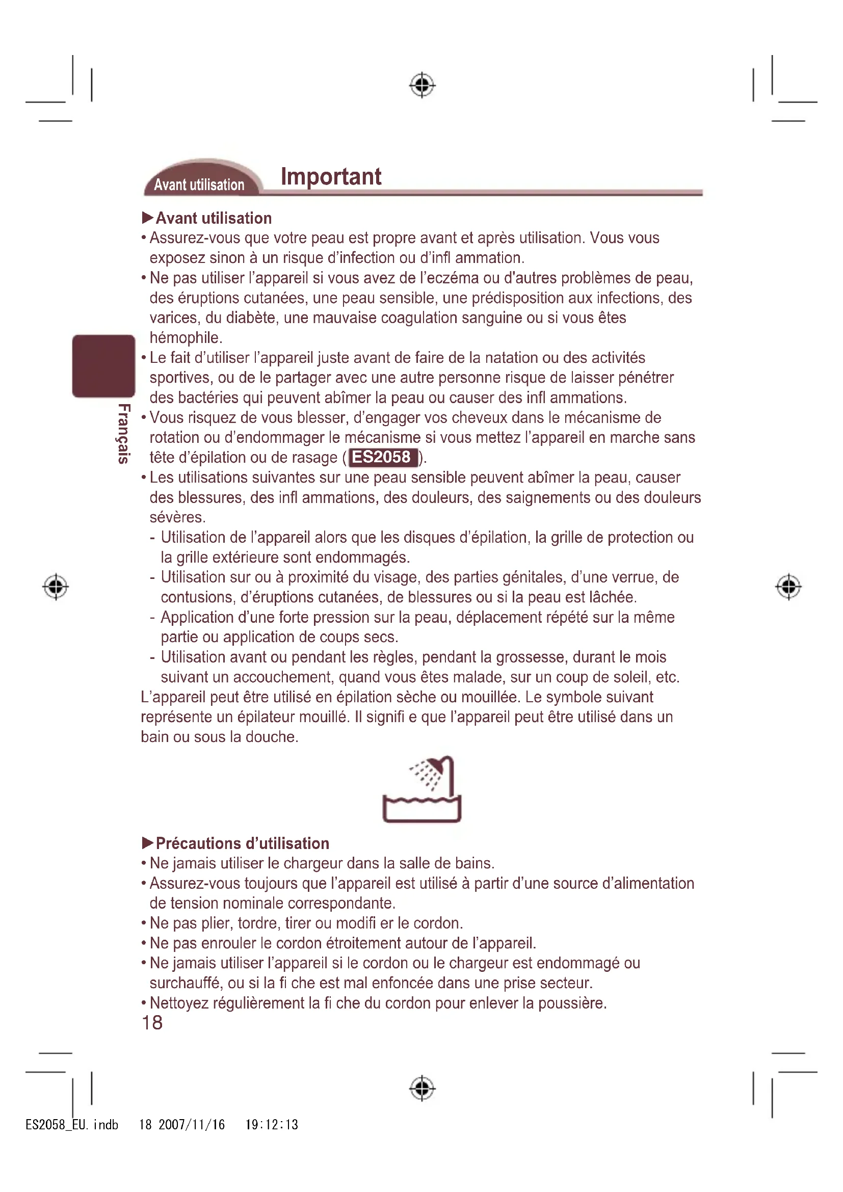 Rahmen-Freigabeknopf Zubehör: Ladegerät (RE7-44), Reinigungsbürste und Tasche (Verwenden Sie keine anderen Zubehörteile als die mitgelieferten Teile.) ES2058_EU.indb 17 2007/11/16 19:12:1318 Français Important Avant utilisation Avant utilisation Assurez-vous que votre peau est propre avant et après utilisation. Vous vous exposez sinon à un risque d’infection ou d’infl ammation. Ne pas utiliser l’appareil si vous avez de l’eczéma ou d'autres problèmes de peau, des éruptions cutanées, une peau sensible, une prédisposition aux infections, des varices, du diabète, une mauvaise coagulation sanguine ou si vous êtes hémophile. Le fait d’utiliser l’appareil juste avant de faire de la natation ou des activités sportives, ou de le partager avec une autre personne risque de laisser pénétrer des bactéries qui peuvent abîmer la peau ou causer des infl ammations. Vous risquez de vous blesser, d’engager vos cheveux dans le mécanisme de rotation ou d’endommager le mécanisme si vous mettez l’appareil en marche sans tête d’épilation ou de rasage ( ES2058