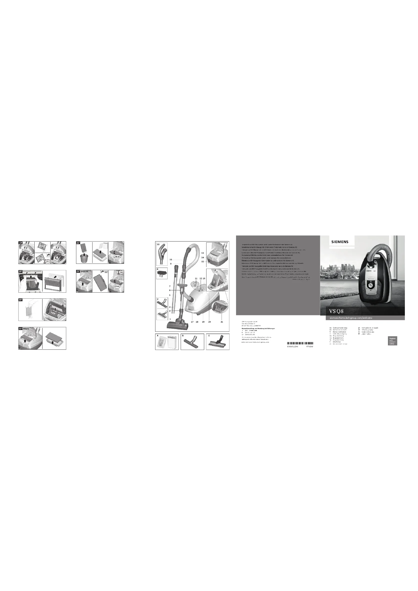 - Depending on model32 Nous vous remercions d'avoir choisi un aspirateur Sie- mens de la série Q8.0. Cette notice d'utilisation présente différents modèles Q8.0. Il se peut donc que toutes les caractéristiques et fonctions décrites ne concernent pas toutes votre aspi- rateur. Utilisez exclusivement les accessoires d'origine Siemens. Ils sont spécialement conçus pour votre aspi- rateur, afin d'obtenir un résultat de nettoyage optimal. Conservez cette notice d'utilisation. Si vous remettez l'aspirateur à une tierce personne, veuillez-y joindre sa notice d'utilisation. Veuillez déplier les volets illustrés ! Description de l'appareil 1 Brosse adaptable au type de sol* (L'aspect de la buse peut être différent de l'illustration, le fonction- nement étant identique) 2 Brosse pour sols durs* 3 Tube télescopique avec manchette (et raccord à clip)* 4 Tube télescopique avec poussoir (et raccord à clip)* 5 Suceur long 6 Porte-accessoire 7 Suceur ameublement 8 Brosse pour meubles (pour le montage sur le suceur ameublement)* 9 Flexible d'aspiration 10 Poignée 11 Indicateur de changement de sac 12 Régulateur rotatif de la puissance et interrupteur marche/arrêt 13 Filtre de sortie d'air 14 Position parking 15 Cordon électrique 16 Volet arrière 17 Poignée de transport 18 Couvercle du compartiment de poussière 19 Position rangement (sur le dessous de l'appareil) 20 Sac aspirateur 21 Filtre de protection du moteur Pièces de rechange et accessoires en option A Paquet de sacs de rechange Filtre type PowerProtect (N° de référence: VZ41FGALL) (« Pour une puissance d'aspiration élevée »/« Pour des performances excellentes et une très grande qualité de nettoyage ») Contenu: - 4 sacs aspirateur avec fermeture - 1 micro-filtre hygiénique Nous vous recommandons d'utiliser exclusivement nos sacs aspirateur d'origine. Votre appareil est un aspirateur hautement perfor- mant qui donne de très bons résultats de nettoyage en cas d'utilisation de sacs aspirateur de qualité su- périeure. Seule l'utilisation de sacs aspirateur de qualité su- périeure tels que plus particulièrement les sacs as- pirateur Siemens d'origine garantit que les valeurs indiquées sur l'étiquette énergie européenne en ma- tière de classe d'efficacité énergétique, de perfor- mance de nettoyage et de capacité de remplissage du sac soient atteintes. L'utilisation de sacs aspirateur de moindre qualité (par ex. sacs en papier) peut, en outre, nuire à la durée de vie et aux performances de votre appareil. Pour finir, l'utilisation de sacs aspirateur inappropri- és ou de moindre qualité risque d'endommager votre aspirateur. De tels dommages ne sont pas couverts par notre garantie. Vous obtiendrez de plus amples informations à ce sujet sous www.siemens-home.bsh-group.com/dust-bag. Vous y avez également la possibilité de commander nos sacs aspirateur d'origine. B Brosse pour sols durs VZ123HD Pour aspirer sur des sols lisses (parquets, carrelages, dalles de terre cuite,...) C Brosse pour sols durs VZ124HD Brosse innovante pour sols durs soft & roll : 2 rouleaux brossants rotatifs en poils naturels. Les grosses salissures ne sont pas poussées devant la brosse. Avant la première utilisation Fig.