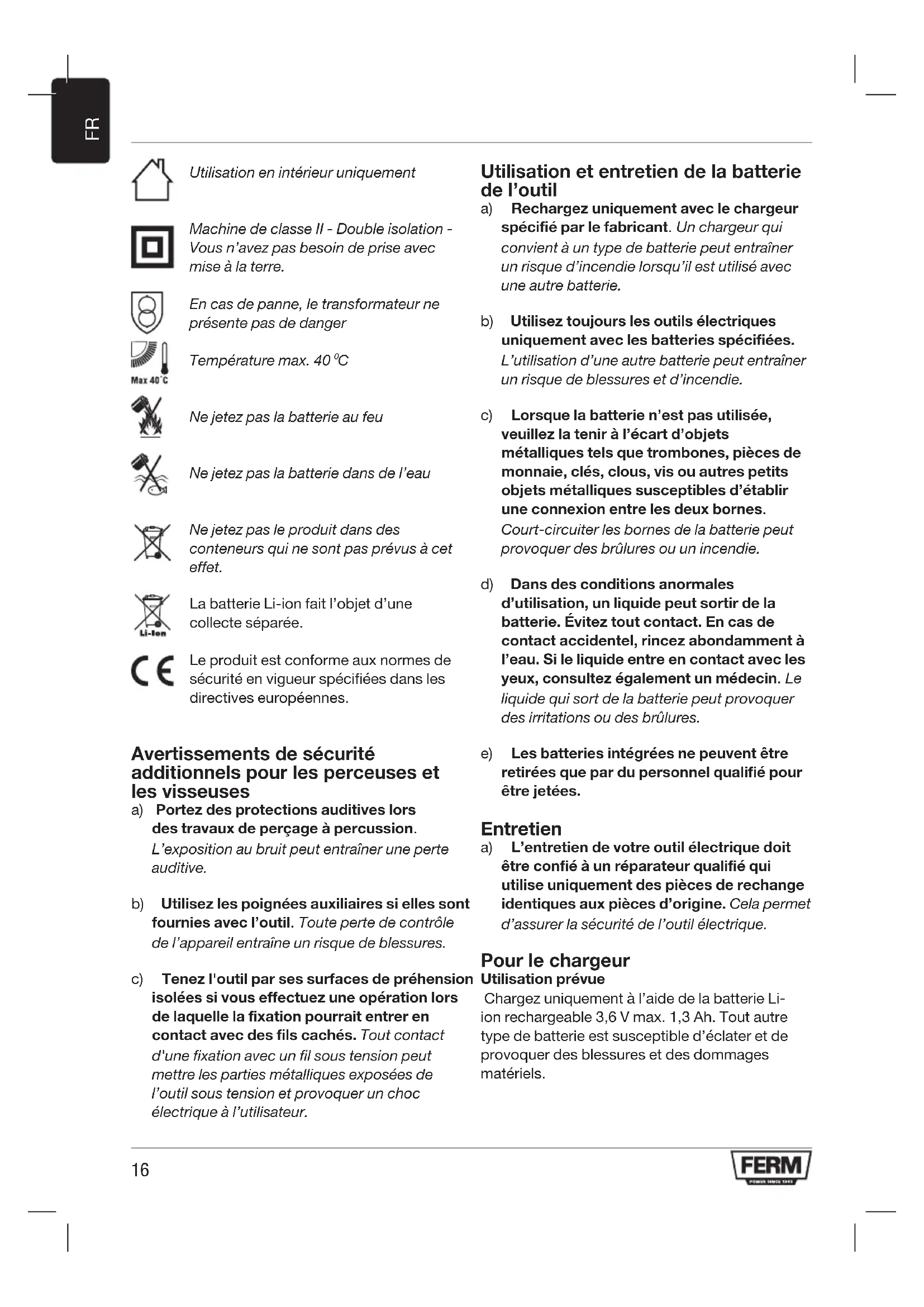 ni sales. Utilisez un chiffon doux légèrement humidifié avec de la mousse de savon pour nettoyer les taches persistantes. N’utilisez pas de produits de nettoyage tels que l’essence, l’alcool, l’ammoniac, etc. ; ces produits peuvent endommager les parties synthétiques. GARANTIE Les conditions de garantie sont disponibles dans le certificat de garantie fourni séparément. ENVIRONNEMENT Les équipements électroniques ou électriques défectueux ou destinés à être mis au rebut doivent être déposés aux points de recyclage appropriés. Uniquement pour les pays de l’UE Ne jetez pas les outils électriques avec les déchets domestiques. Selon la Directive européenne 2012/19/CE relative aux déchets d’équipements électriques et électroniques et sa mise en œuvre dans le droit national, les outils électriques hors d’usage doivent être collectés séparément et mis au rebut de manière écologique. Le produit et le manuel d’utilisation sont sujets à modifications. Les spécifications peuvent changer sans préavis. Destornillador con baterías de iones de litio 3.6 V CDM1132 Gracias por comprar este producto de Ferm. Ahora dispone de un excelente producto, suministrado por uno de los principales proveedores de Europa. Todos los productos suministrados por Ferm son fabricados de acuerdo con los más elevados estándares de rendimiento y seguridad. Como parte de nuestra filosofía, proporcionamos también un excelente servicio al cliente, respaldado por nuestra garantía integral. Esperamos que disfrute del uso de este producto durante muchos años.