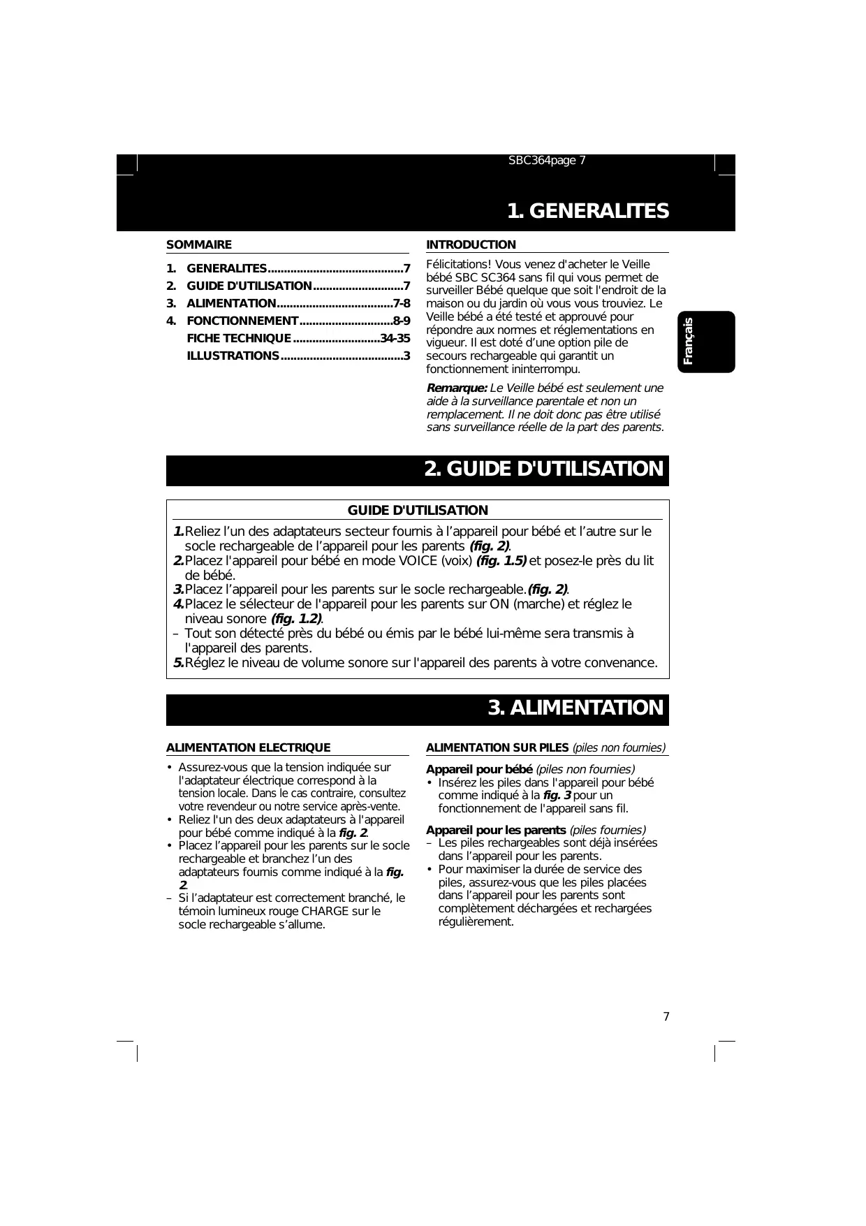 Félicitations! Vous venez d'acheter le Veille bébé SBC SC364 sans fil qui vous permet de surveiller Bébé quelque que soit l'endroit de la maison ou du jardin où vous vous trouviez. Le Veille bébé a été testé et approuvé pour répondre aux normes et réglementations en vigueur. Il est doté d’une option pile de secours rechargeable qui garantit un fonctionnement ininterrompu. Remarque: Le Veille bébé est seulement une aide à la surveillance parentale et non un remplacement. Il ne doit donc pas être utilisé sans surveillance réelle de la part des parents.