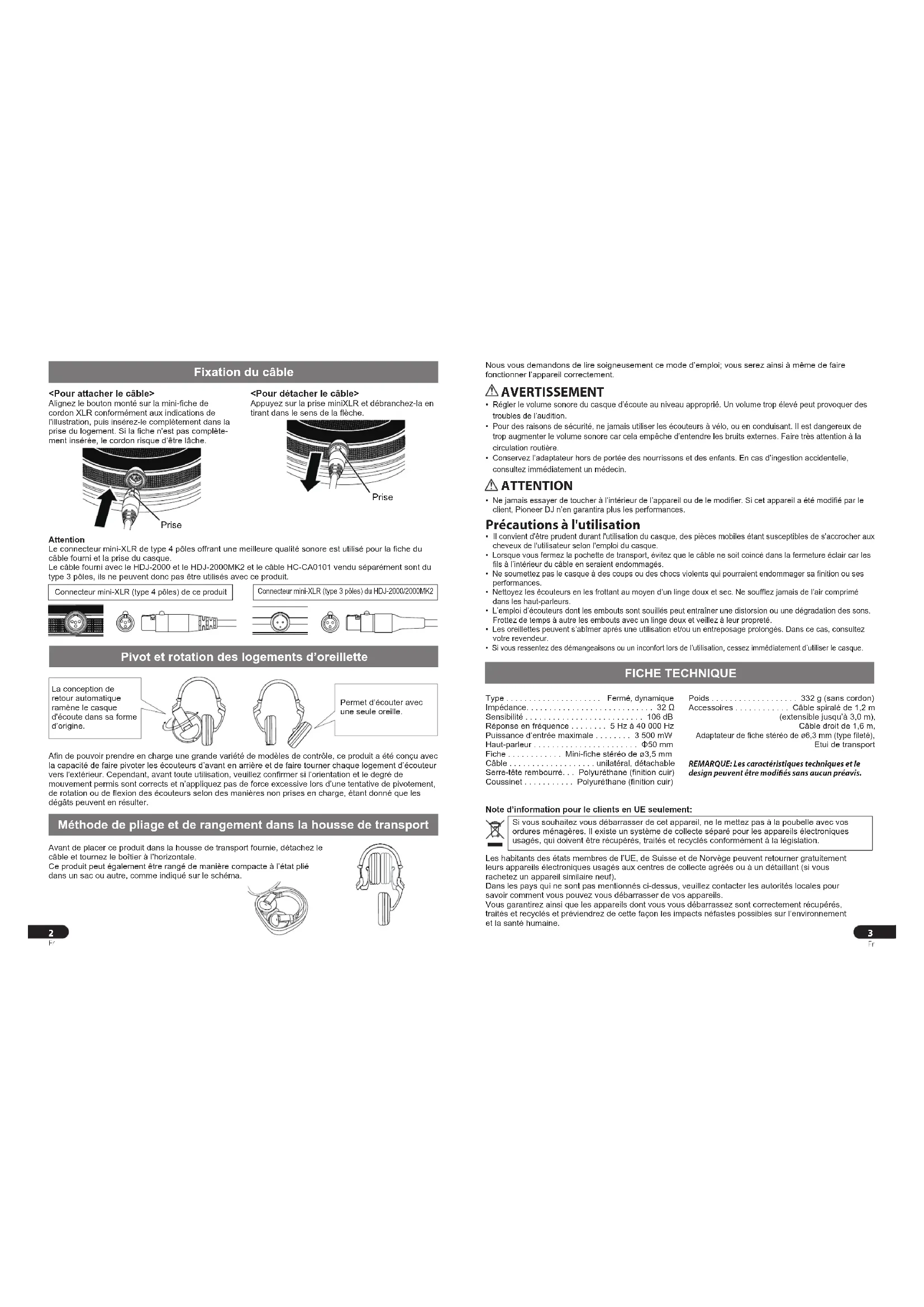 Fixation du câble Méthode de pliage et de rangement dans la housse de transport Avant de placer ce produit dans la housse de transport fournie, détachez le câble et tournez le boîtier à l’horizontale.Ce produit peut également être rangé de manière compacte à l’état plié dans un sac ou autre, comme indiqué sur le schéma. <Pour attacher le câble> Alignez le bouton monté sur la mini-fiche de cordon XLR conformément aux indications de l'illustration, puis insérez-le complètement dans la prise du logement. Si la fiche n'est pas complète-ment insérée, le cordon risque d’être lâche. <Pour détacher le câble> Appuyez sur la prise miniXLR et débranchez-la en tirant dans le sens de la flèche.Connecteur mini-XLR (type 4 pôles) de ce produitConnecteur mini-XLR (type 3 pôles) du HDJ-2000/2000MK2AttentionLe connecteur mini-XLR de type 4 pôles offrant une meilleure qualité sonore est utilisé pour la fiche du câble fourni et la prise du casque.Le câble fourni avec le HDJ-2000 et le HDJ-2000MK2 et le câble HC-CA0101 vendu séparément sont du type 3 pôles, ils ne peuvent donc pas être utilisés avec ce produit. Pivot et rotation des logements d’oreillette Afin de pouvoir prendre en charge une grande variété de modèles de contrôle, ce produit a été conçu avec la capacité de faire pivoter les écouteurs d’avant en arrière et de faire tourner chaque logement d’écouteur vers l'extérieur. Cependant, avant toute utilisation, veuillez confirmer si l’orientation et le degré de mouvement permis sont corrects et n’appliquez pas de force excessive lors d’une tentative de pivotement, de rotation ou de flexion des écouteurs selon des manières non prises en charge, étant donné que les dégâts peuvent en résulter.La conception de retour automatique ramène le casque d'écoute dans sa forme d’origine.Permet d’écouter avec une seule oreille.Type . . . . . . . . . . . . . . . . . . . . . Fermé, dynamiqueImpédance. . . . . . . . . . . . . . . . . . . . . . . . . . . . 32 ΩSensibilité . . . . . . . . . . . . . . . . . . . . . . . . . . 106 dBRéponse en fréquence . . . . . . . . 5 Hz à 40 000 HzPuissance d’entrée maximale . . . . . . . . 3 500 mWHaut-parleur . . . . . . . . . . . . . . . . . . . . . . . Φ50 mmFiche . . . . . . . . . . . . Mini-fiche stéréo de ø3,5 mmCâble . . . . . . . . . . . . . . . . . . . unilatéral, détachableSerre-tête rembourré. . . Polyuréthane (finition cuir)Coussinet . . . . . . . . . . . Polyuréthane (finition cuir)Poids . . . . . . . . . . . . . . . . . . . 332 g (sans cordon)Accessoires . . . . . . . . . . . . Câble spiralé de 1,2 m (extensible jusqu’à 3,0 m),Câble droit de 1,6 m,Adaptateur de fiche stéréo de ø6,3 mm (type fileté),Etui de transportREMARQUE: Les caractéristiques techniques et le design peuvent être modiés sans aucun préavis. FICHE TECHNIQUE Si vous souhaitez vous débarrasser de cet appareil, ne le mettez pas à la poubelle avec vos ordures ménagères. Il existe un système de collecte séparé pour les appareils électroniques usagés, qui doivent être récupérés, traités et recyclés conformément à la législation.Les habitants des états membres de l’UE, de Suisse et de Norvège peuvent retourner gratuitement leurs appareils électroniques usagés aux centres de collecte agréés ou à un détaillant (si vous rachetez un appareil similaire neuf).Dans les pays qui ne sont pas mentionnés ci-dessus, veuillez contacter les autorités locales pour savoir comment vous pouvez vous débarrasser de vos appareils.Vous garantirez ainsi que les appareils dont vous vous débarrassez sont correctement récupérés, traités et recyclés et préviendrez de cette façon les impacts néfastes possibles sur l’environnement et la santé humaine.Note d’information pour le clients en UE seulement:Nous vous demandons de lire soigneusement ce mode d’emploi; vous serez ainsi à même de faire fonctionner l’appareil correctement. Précautions à l'utilisation