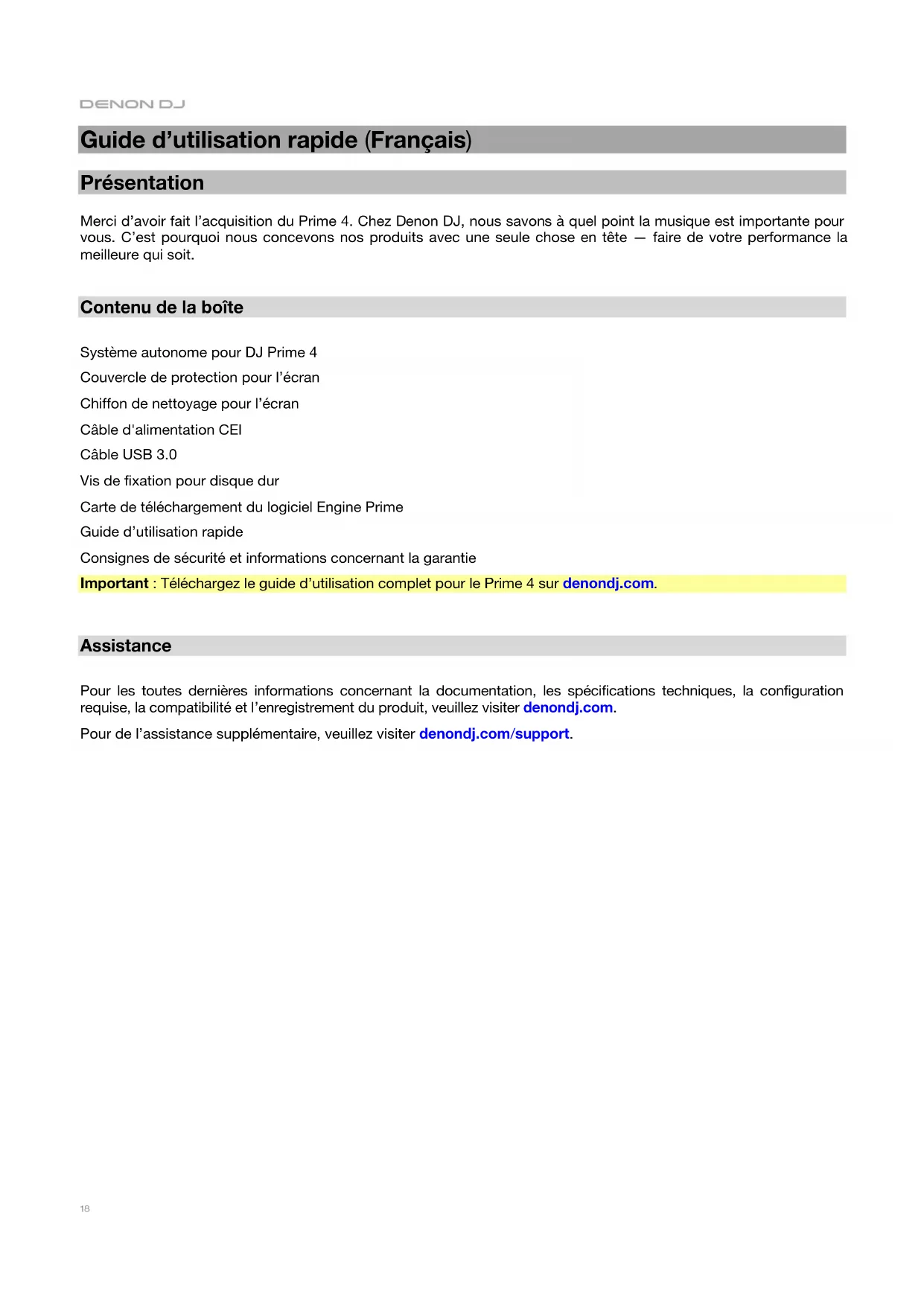 Assistance Pour les toutes dernières informations concernant la documentation, les spécifications techniques, la configuration requise, la compatibilité et l’enregistrement du produit, veuillez visiter denondj.com. Pour de l’assistance supplémentaire, veuillez visiter denondj.com/support.19 Installation Important : À l’occasion, il se peut que nous procédions à des mises à jour du progiciel du Prime 4 afin d’ajouter des fonctionnalités et d’améliorer sa performance. Veuillez visiter denondj.com afin de vérifier s’il y a des mises à jour du progiciel disponibles, surtout si vous mettez à jour votre logiciel (les mises à jour du progiciel peuvent permettent l’utilisation des nouvelles fonctionnalités logicielles).