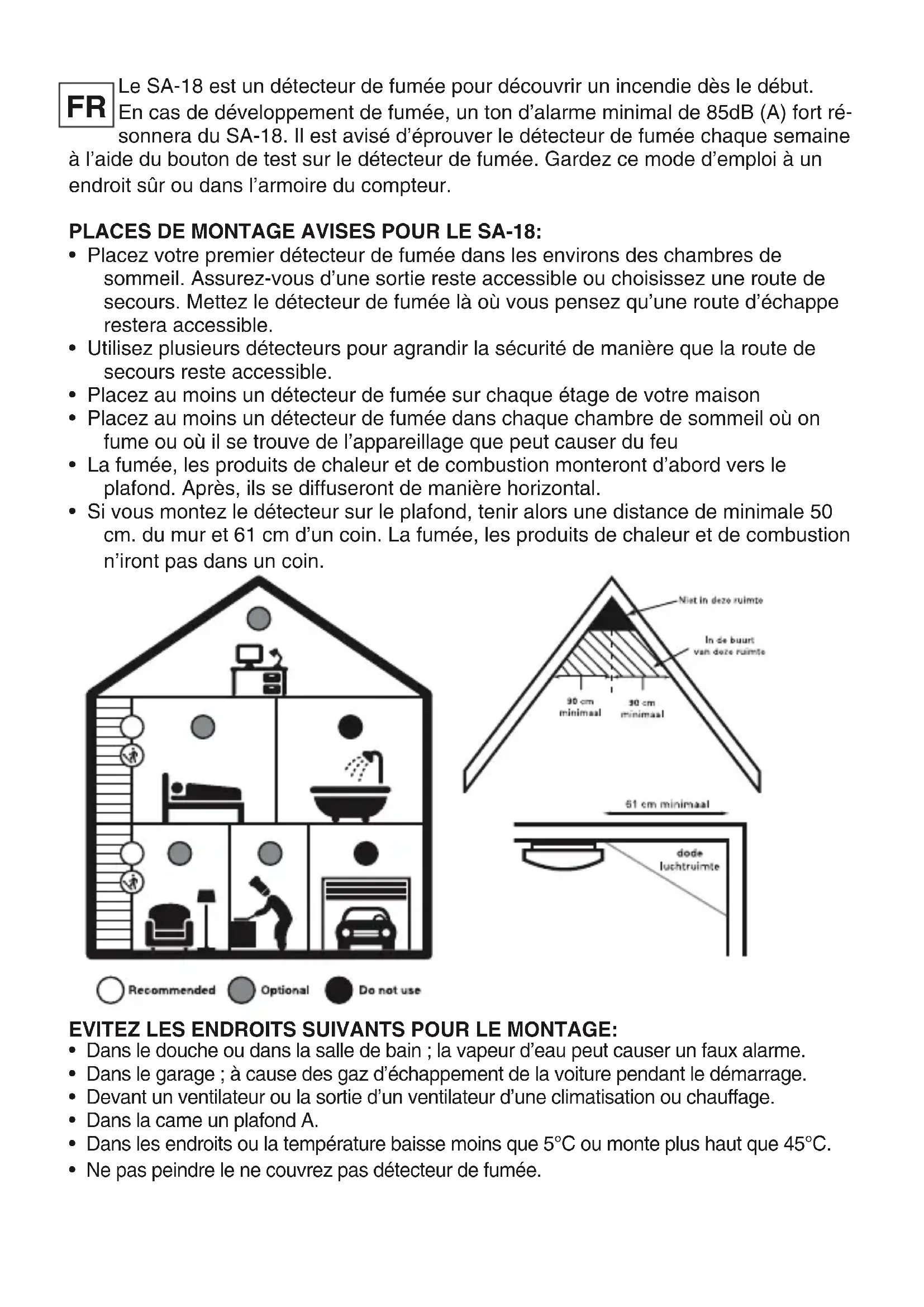 - Quand vous vous trouvez dehors, contactez le service d’incendie le plus vite que possible (112). REMPLACER LA PILE: Le détecteur est alimenté par une pile bloque de 9 Volt. Utilisez seulement les piles suivantes avisée Pairdeer 6F22. Pendant un usage normal, la pile aura une longévité de 1 an au minimum. Quand la pile doit être remplacée, le détecteur produira un ton aigu toutes les 30 à 40 secondes. Ce ton continuera pendant 30 jours au minimum. Il n’est pas possible de fixer le détecteur sur le plafond sans avoir mis la plaque de pla- fond. Le détecteur ne peut pas être mis sur la plaque de plafond sans pile. Quand la pile a été bien mise, le détecteur peut être tourné simplement sur la plaque de plafond. Faites attention à la polarité en mettant une (nouvelle) pile. ENVIRONNEMENT: Ne jetez pas les piles vides aux ordures ménagères mais rendez les à votre dêpot local des déchets chimiques. Au terme du cycle de vie de ce produit, vous ne devez pas jeter le produit dans les déchets ménagers ordinaires mais le déposer dans un point de collecte pour le recyclage des équipements électriques et électroniques. DECLARATION OF CONFORMITY: Elle peut être téléchargée de notre site www.alecto.nl.Das SA-18 Gerät ist ein Rauchmelder, der die Entwicklung von Rauch schon in der ersten Phase erkennt. Bei Rauchentwicklung wird der SA-18 ein lautes Alarmsignal von minimal 85dB (A) von sich geben. Es wird empfohlen, jede Woche den Rauchmelder durch Betätigung des Testknopfes zu überprüfen. Bewahren Sie diese Gebrauchsanweisung an einem geeigneten Platz auf. GEEIGNETE MONTAGEPLÄTZE FÜR DAS SA-18 GERÄT: