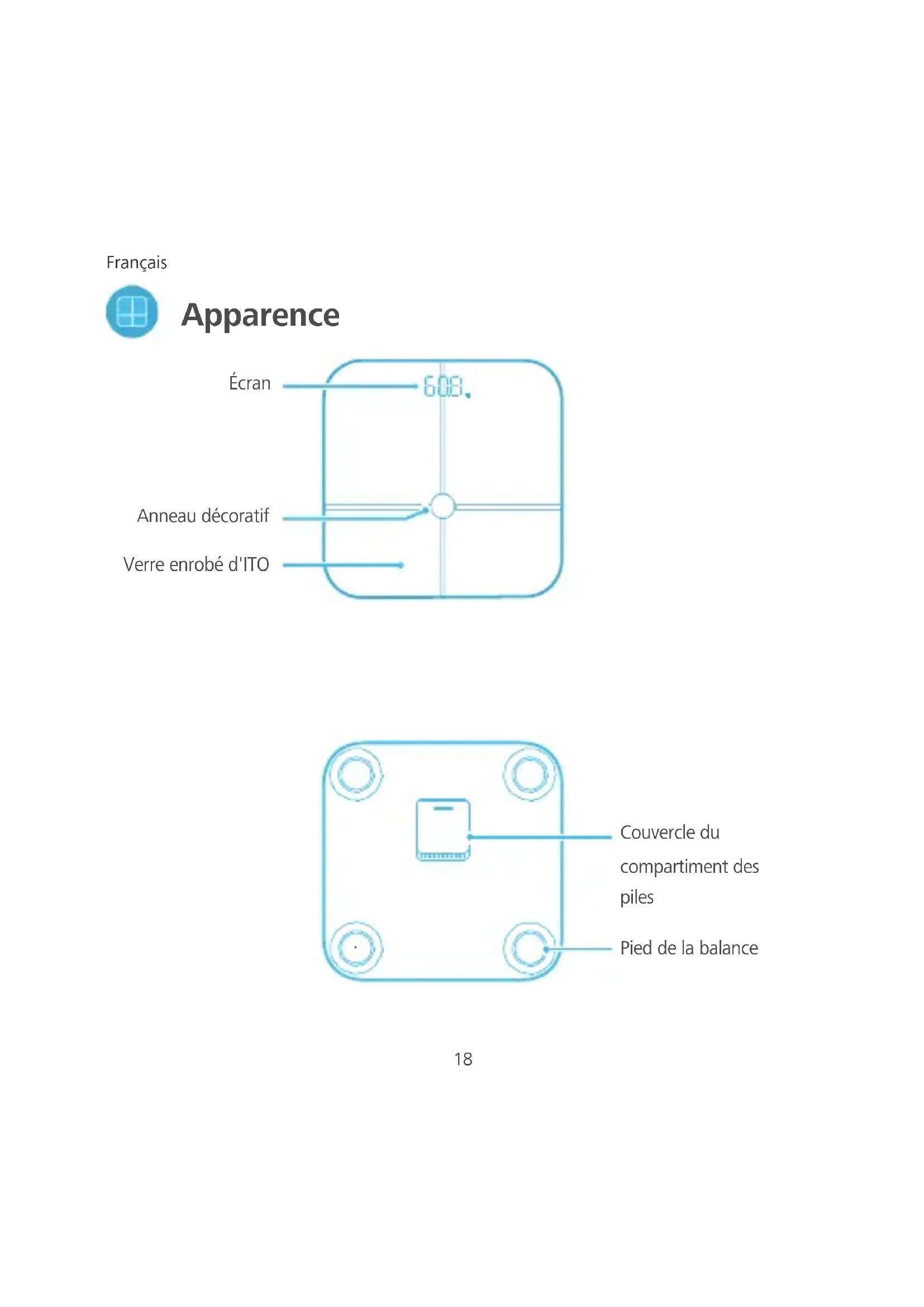 Apparence ÉcranAnneau décoratif Verre enrobé d'ITO Couvercle ducompartiment despilesPied de la balance19