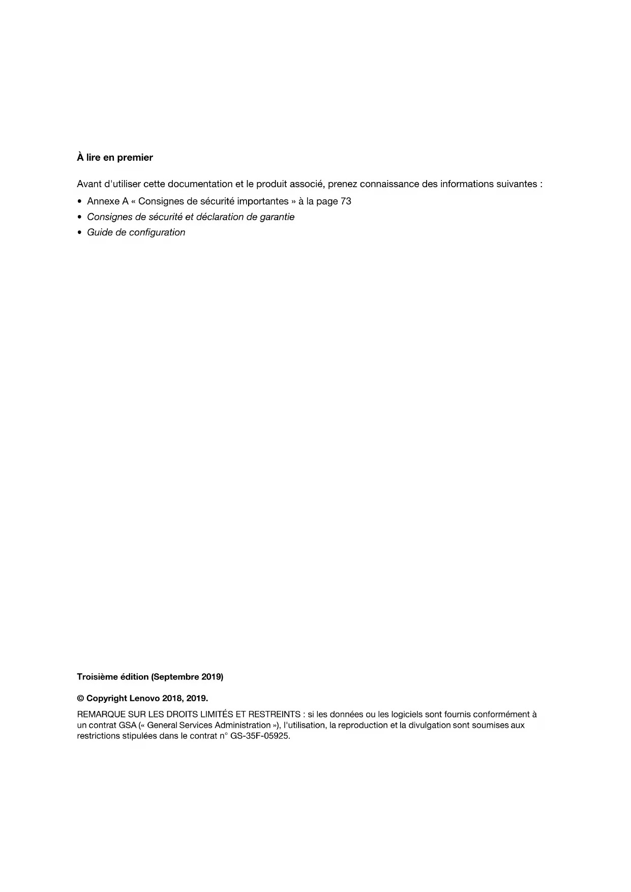 - Guide de configuration Troisième édition (Septembre 2019) © Copyright Lenovo 2018, 2019. REMARQUE SUR LES DROITS LIMITÉS ET RESTREINTS : si les données ou les logiciels sont fournis conformément à un contrat GSA (« General Services Administration »), l'utilisation, la reproduction et la divulgation sont soumises aux restrictions stipulées dans le contrat n° GS-35F-05925.Table des matières À propos de cette documentation . . . . iii