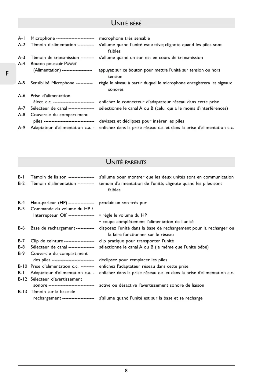 - coupe complètement l’alimentation de l’unité disposez l’unité dans la base de rechargement pour la recharger ou la faire fonctionner sur le réseau clip pratique pour transporter l’unité sélectionne le canal A ou B (le même que l’unité bébé) déclipsez pour remplacer les piles enfichez l’adaptateur réseau dans cette prise enfichez dans la prise réseau c.a. et dans la prise d’alimentation c.c. active ou désactive l’avertissement sonore de liaison s’allume quand l’unité est sur la base et se recharge