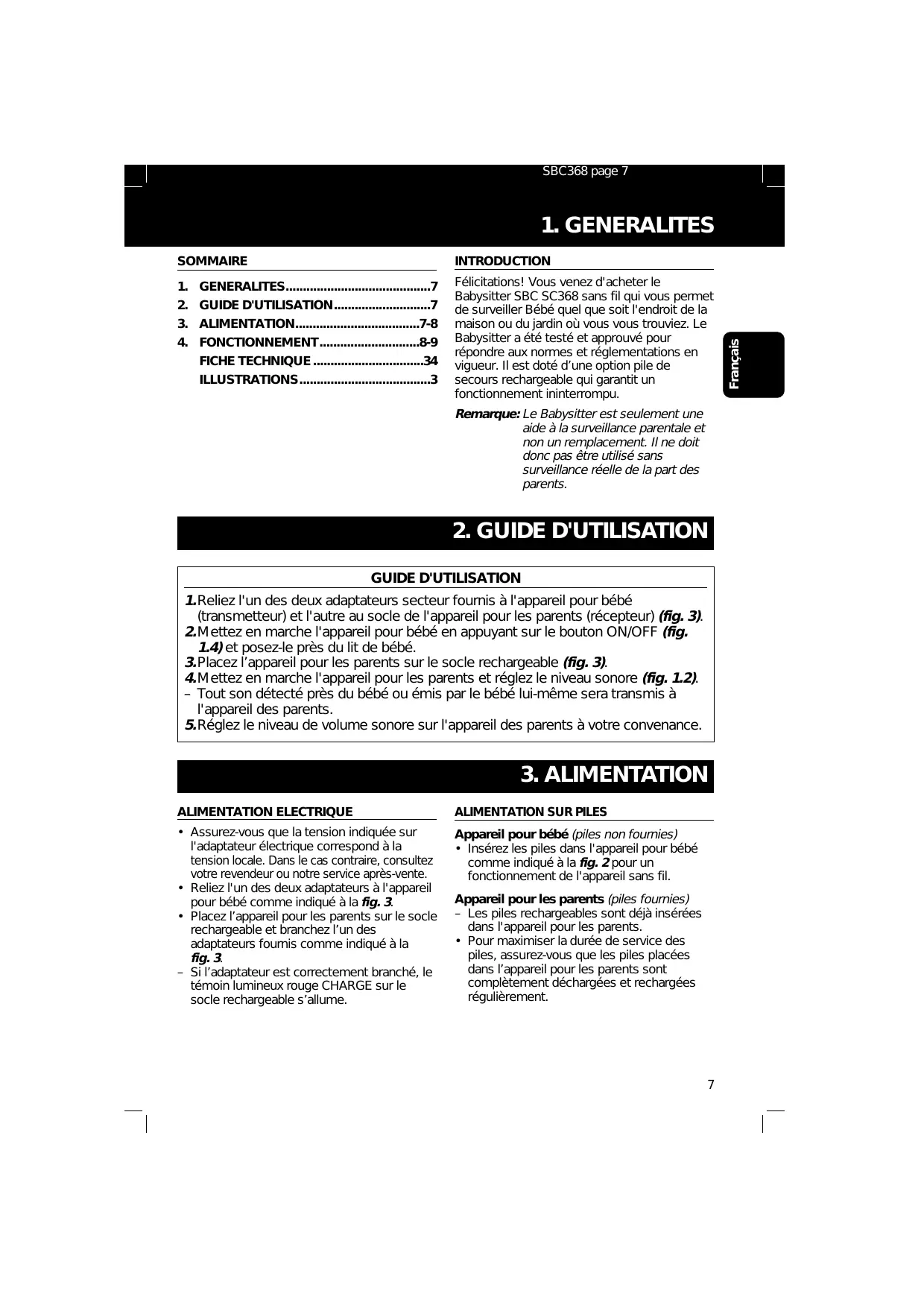 Félicitations! Vous venez d'acheter le Babysitter SBC SC368 sans fil qui vous permet de surveiller Bébé quel que soit l'endroit de la maison ou du jardin où vous vous trouviez. Le Babysitter a été testé et approuvé pour répondre aux normes et réglementations en vigueur. Il est doté d’une option pile de secours rechargeable qui garantit un fonctionnement ininterrompu. Remarque: Le Babysitter est seulement une aide à la surveillance parentale et non un remplacement. Il ne doit donc pas être utilisé sans surveillance réelle de la part des parents.