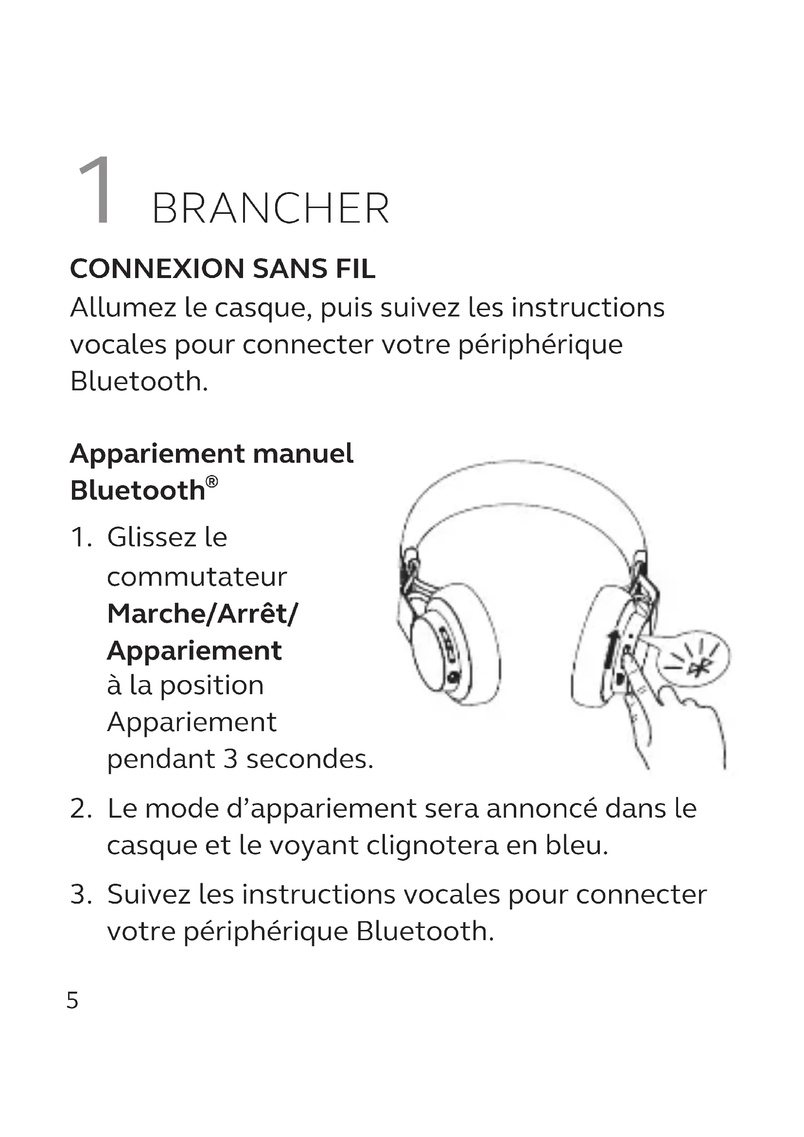Allumez le casque, puis suivez les instructions vocales pour connecter votre périphérique Bluetooth. Appariement manuel Bluetooth