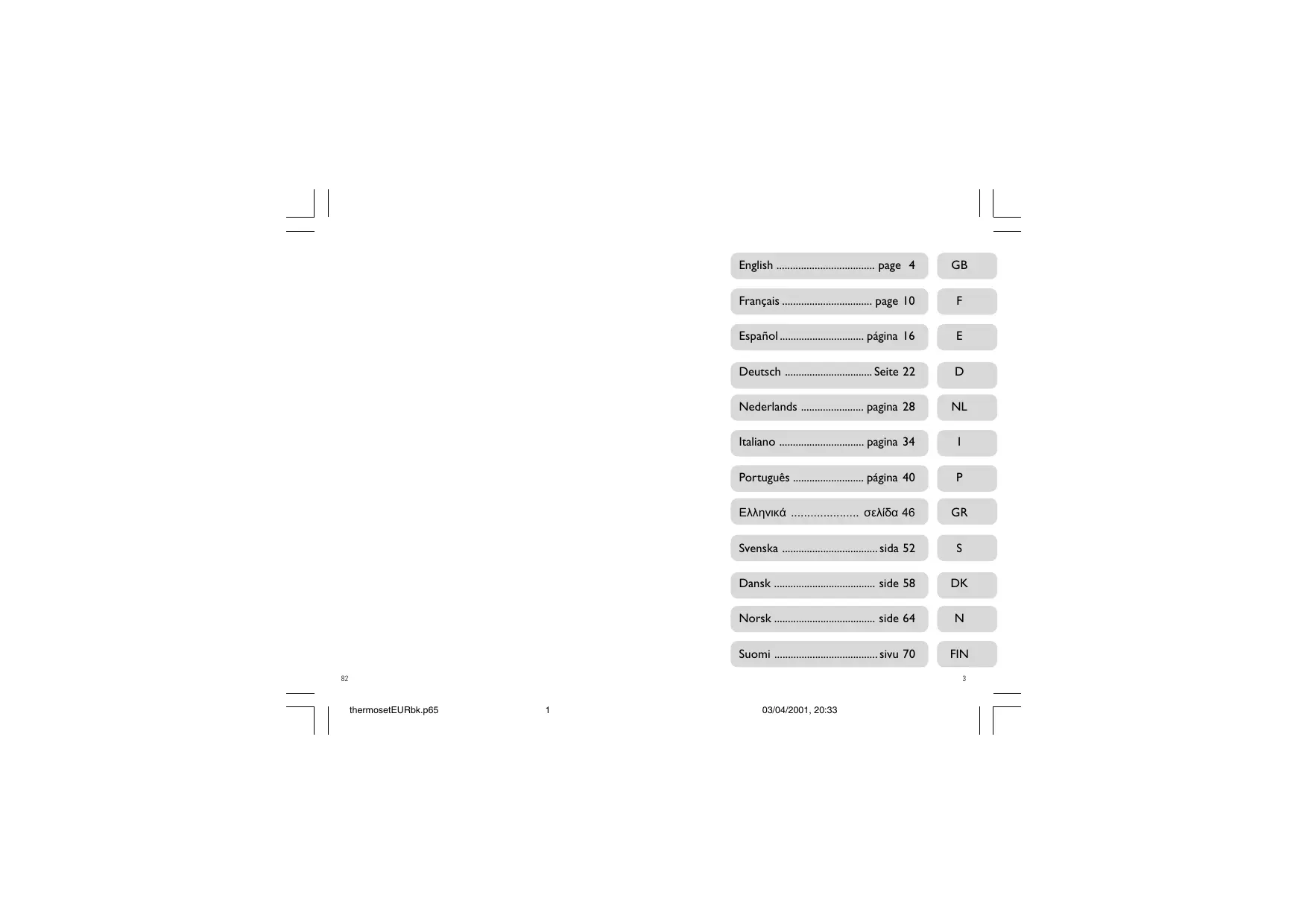 03/04/2001, 20:33 Thermomètre pour bébé Le thermomètre pour bébé Philips vous permet de mesurer facilement et avec précision la température de bébé. Ce thermomètre a été étudié pour optimiser la sécurité, le confort et le bien-être de bébé, et donc le vôtre. Il fait partie d’une gamme complète de produits de soins pour bébé. Veuillez lire attentivement cette notice avant d’utiliser le thermomètre, et conservez-la pour toute consultation future. La boîte de rangement contient trois articles: - Un thermomètre tétine pour mesurer très précisément la température de bébé. Il est très convivial, tant pour vous que pour bébé. - Une tétine ordinaire pour que bébé s’habitue à la forme. Vous pouvez l’utiliser comme tétine normale. - Un thermomètre à embout flexible pour mesurer la température rectale de bébé si vous souhaitez vérifier la prise de température. Respectez scrupuleusement les directives de sécurité pour que votre bébé ne coure aucun danger. Comment utiliser les ther momètr thermomètr momètres La manière la plus facile de mesurer la température de bébé, c’est d’utiliser le thermomètre tétine en suivant les indications ci-jointes. Cette méthode vous donne une indication très fiable. Si vous souhaitez vérifier la température (si, par exemple, la première mesure dépasse 38°C), utilisez le thermomètre à embout flexible pour prendre la température rectale (dans l’anus). Il faut savoir que les mesures orales sont généralement inférieures de 0,5 à 1°C à la température réelle du corps. Températur empératuree des enfants La température d’un enfant se situe normalement entre 36,5 et 37,5°C. N’oubliez toutefois pas qu’elle peut varier en fonction de l’âge, des activités, de l’heure etc. Sachez aussi que certaines maladies n’impliquent pas qu’il y ait de la fièvre. La prise de température ne peut en rien supprimer le besoin de consulter un médecin. Quand vous parlerez de la température de l’enfant à un professionnel, expliquez-lui la méthode de mesure. Kuumeen mittaaminen vanhemmilta lapsilta Isompien lasten sekä aikuisten ruumiinlämpö voidaan mitata joustavakärkisellä digitaalisella kuumemittarilla myös suusta tai kainalosta (epäluotettavin mittaustapa). Jos kuumemittaria on käytetty peräaukossa ilman mittapään suojusta, sitä ei suositella enää käytettäväksi suussa. Puhdistus Puhdista kuumemittari aina käytön jälkeen. Älä steriloi kuumemittaria äläkä puhdista sitä keittämällä. Kotikäytössä riittää, että kuumemittari pyyhitään pehmeällä, kostealla liinalla tai pestään vedellä. Kuumemittari on vedenkestävä. Älä pese sitä astianpesukoneessa. Pariston vaihto Kuumemittarissa on pitkäikäinen paristo, jonka tulisi kestää 2-3 vuotta. Kun paristo alkaa olla tyhjä, näytössä näkyy merkki . Älä käytä tällöin kuumemittaria, ennen kuin olet vaihtanut pariston. Paristo vaihdetaan seuraavasti: