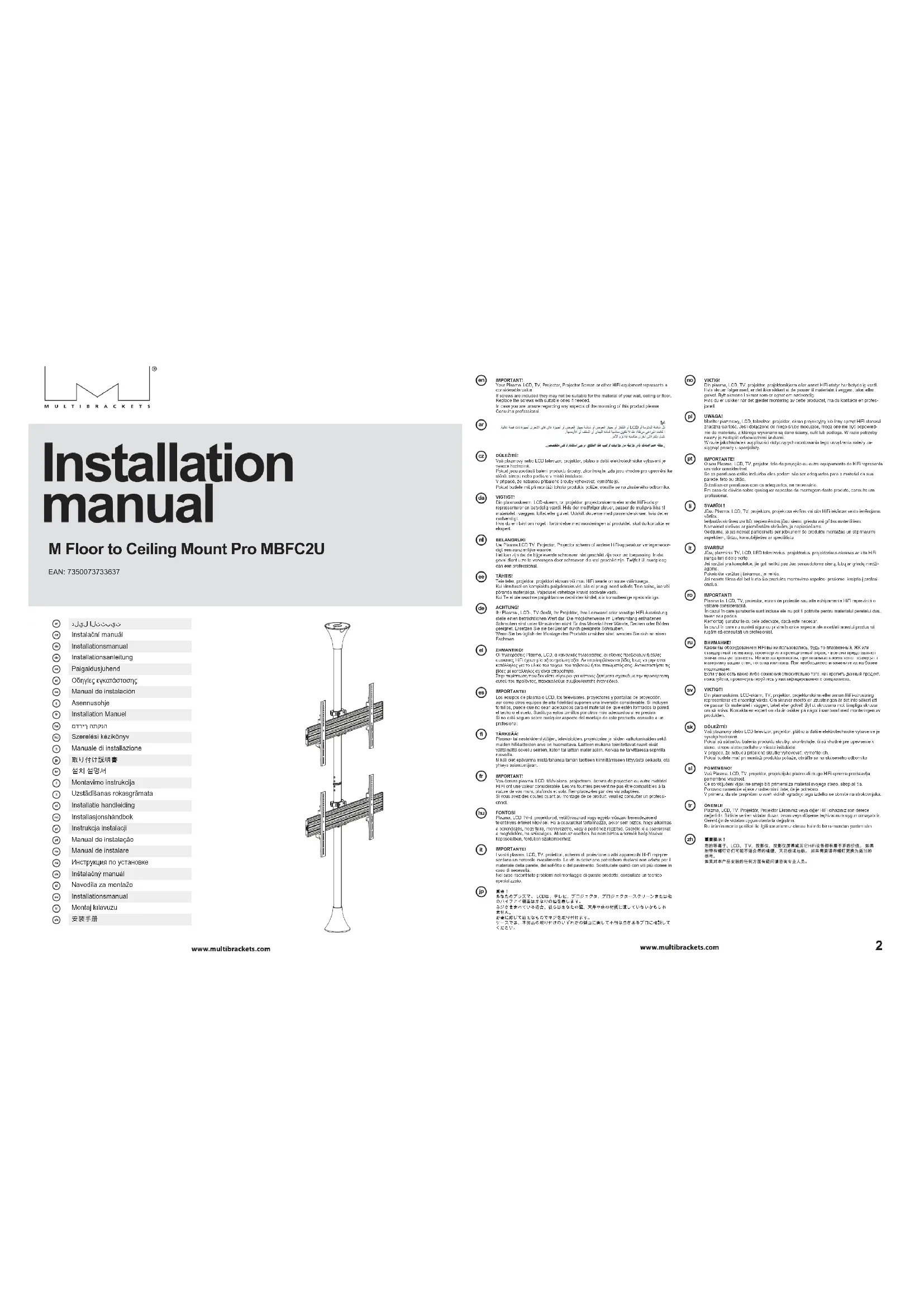 Retrouvez gratuitement la notice de l'appareil M Floor to Ceiling Mount Pro MBFC2U Multibrackets au format PDF.