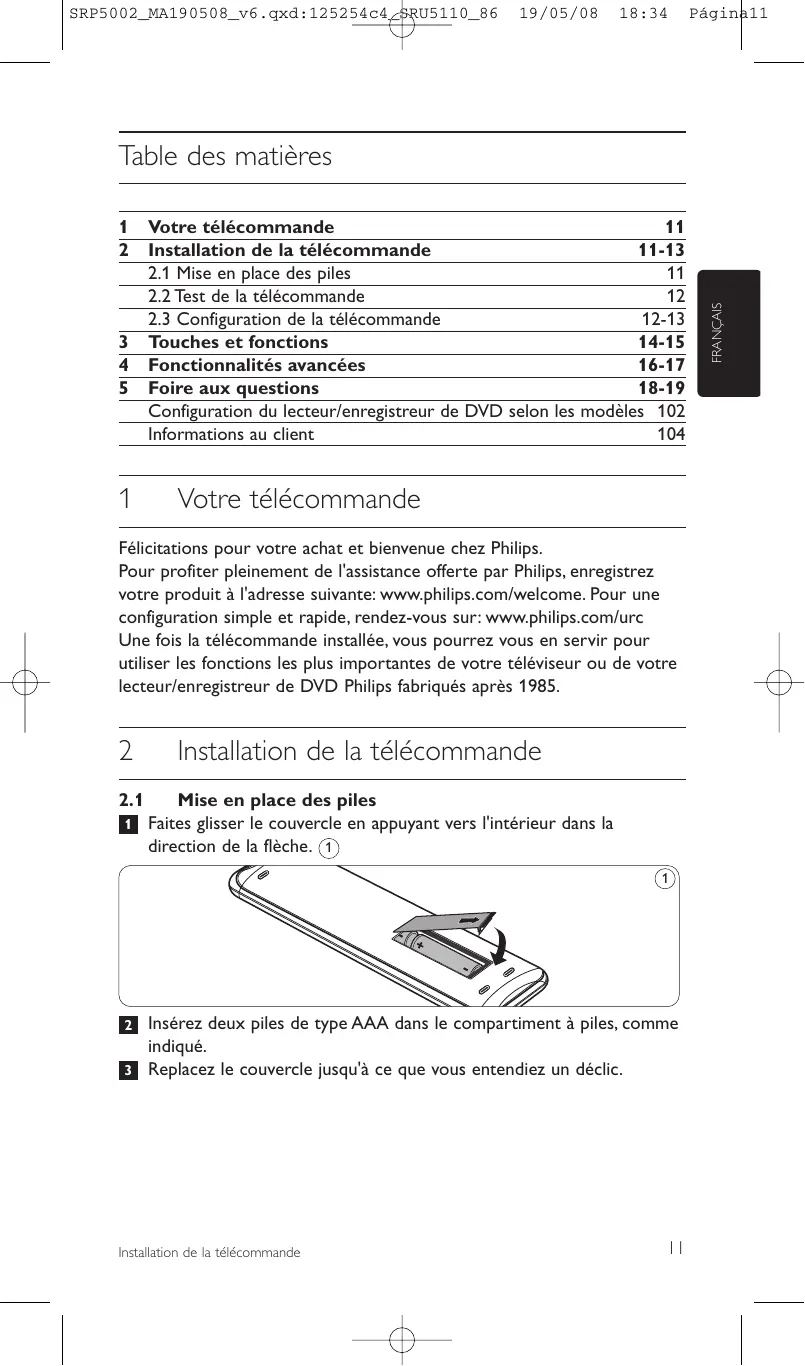 Votre télécommande 11 Installation de la télécommande 11-13 2.1 Mise en place des piles 11 2.2 Test de la télécommande 12 2.3 Configuration de la télécommande 12-13 Touches et fonctions 14-15 Fonctionnalités avancées 16-17 Foire aux questions 18-19 Configuration du lecteur/enregistreur de DVD selon les modèles 102 Informations au client 104