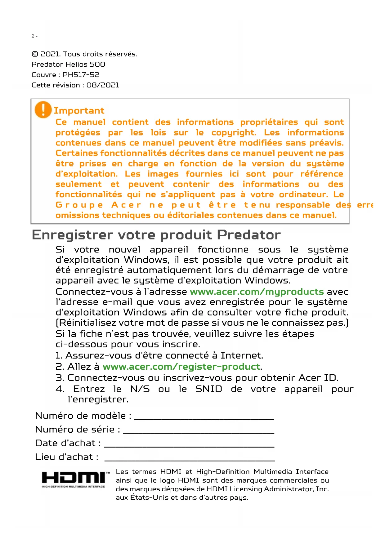 © 2021. Tous droits réservés. Predator Helios 500 Couvre : PH517-52 Cette révision : 08/2021 Enregistrer votre produit Predator Si votre nouvel appareil fonctionne sous le système d’exploitation Windows, il est possible que votre produit ait été enregistré automatiquement lors du démarrage de votre appareil avec le système d’exploitation Windows. Connectez-vous à l’adresse www.acer.com/myproducts avec l’adresse e-mail que vous avez enregistrée pour le système d’exploitation Windows afin de consulter votre fiche produit. (Réinitialisez votre mot de passe si vous ne le connaissez pas.) Si la fiche n’est pas trouvée, veuillez suivre les étapes ci-dessous pour vous inscrire.