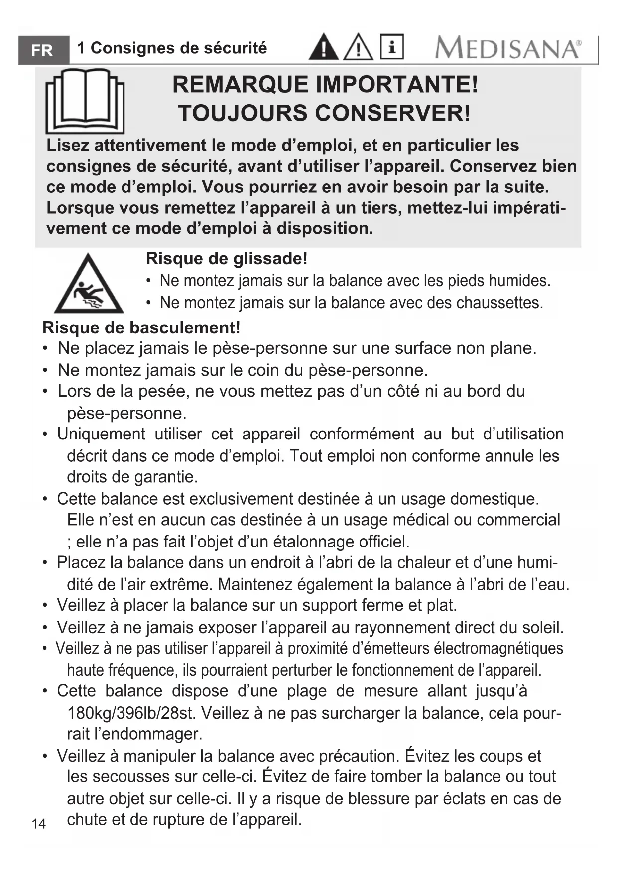 - Lors de la pesée, ne vous mettez pas d’un côté ni au bord du pèse-personne. 1 Consignes de sécurité FR15 1 Consignes de sécurité