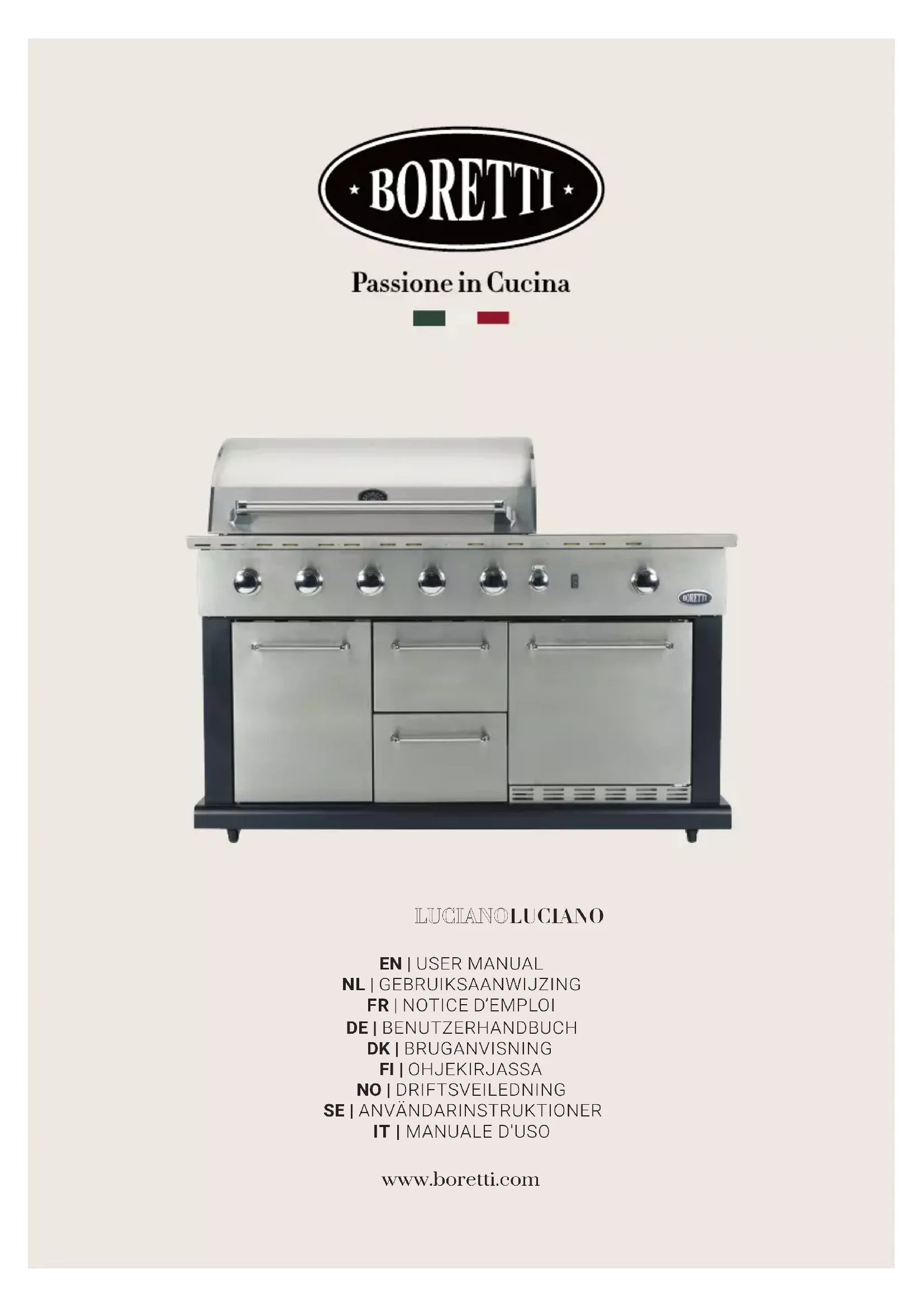 - Ce barbecue porte les logo et marquage conformément à la directive européenne 2002/96EG sur l'élimination des appareils ménagers. La directive définit les normes concernant la collecte et le recyclage des appareils ménagers s'appliquant à l'ensemble du territoire de l'Union européenne. Pour les accessoires de barbecue, les conditions de garantie et de service ainsi que toute autre question, rendez-vous sur www.boretti.com Vous pouvez également envoyer vos questions et suggestions info@boretti.com Boretti BV Abberdaan 114 1046 AA Amsterdam LUCIANOLUCIANO DE | BENUTZERHANDBUCH www.boretti.comAppliance name: Gas grill Model number: Luciano Category: I3+, I3B/P(30) Q.: Total 24,9kW (1812g/h) Injector size Main burners 14.8kW IR Back 3.7kW Side burner 3.2 kW IR Bottom 3.2 kW Main burners: 0.93 IR Back: 0.93 Side burner: 0.84 IR Bottom: 0.85 2531/