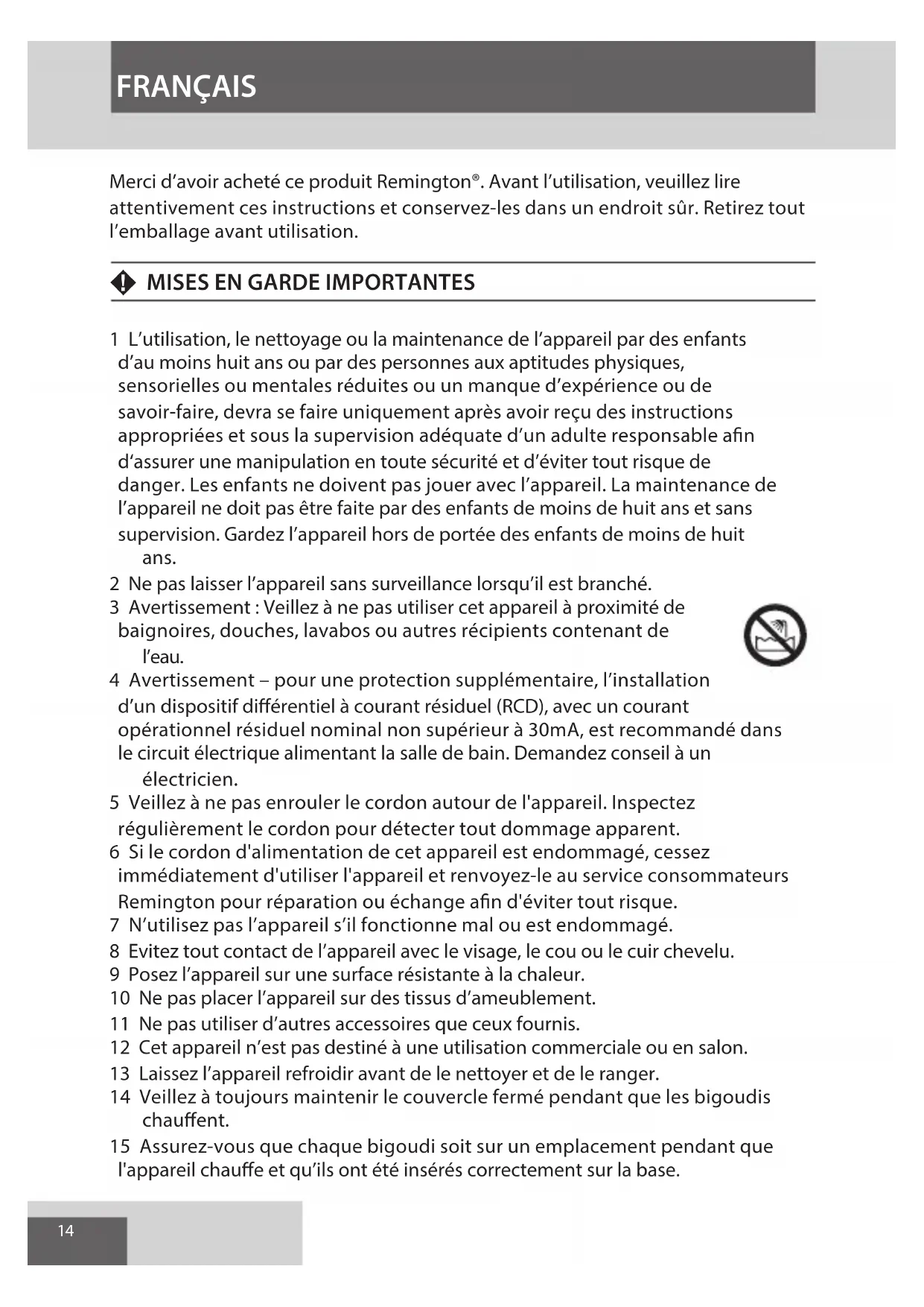 1 L’utilisation, le nettoyage ou la maintenance de l’appareil par des enfants d’au moins huit ans ou par des personnes aux aptitudes physiques, sensorielles ou mentales réduites ou un manque d’expérience ou de savoir-faire, devra se faire uniquement après avoir reçu des instructions appropriées et sous la supervision adéquate d’un adulte responsable an d‘assurer une manipulation en toute sécurité et d’éviter tout risque de danger. Les enfants ne doivent pas jouer avec l’appareil. La maintenance de l’appareil ne doit pas être faite par des enfants de moins de huit ans et sans supervision. Gardez l’appareil hors de portée des enfants de moins de huit ans. 2 Ne pas laisser l’appareil sans surveillance lorsqu’il est branché. 3 Avertissement : Veillez à ne pas utiliser cet appareil à proximité de baignoires, douches, lavabos ou autres récipients contenant de l’eau. 4 Avertissement – pour une protection supplémentaire, l’installation d’un dispositif diérentiel à courant résiduel (RCD), avec un courant opérationnel résiduel nominal non supérieur à 30mA, est recommandé dans le circuit électrique alimentant la salle de bain. Demandez conseil à un électricien. 5 Veillez à ne pas enrouler le cordon autour de l'appareil. Inspectez régulièrement le cordon pour détecter tout dommage apparent. 6 Si le cordon d'alimentation de cet appareil est endommagé, cessez immédiatement d'utiliser l'appareil et renvoyez-le au service consommateurs Remington pour réparation ou échange an d'éviter tout risque. 7 N’utilisez pas l’appareil s’il fonctionne mal ou est endommagé. 8 Evitez tout contact de l’appareil avec le visage, le cou ou le cuir chevelu. 9 Posez l’appareil sur une surface résistante à la chaleur. 10 Ne pas placer l’appareil sur des tissus d’ameublement. 11 Ne pas utiliser d’autres accessoires que ceux fournis. 12 Cet appareil n’est pas destiné à une utilisation commerciale ou en salon. 13 Laissez l’appareil refroidir avant de le nettoyer et de le ranger. 14 Veillez à toujours maintenir le couvercle fermé pendant que les bigoudis chauent. 15 Assurez-vous que chaque bigoudi soit sur un emplacement pendant que l'appareil chaue et qu’ils ont été insérés correctement sur la base. FRANÇAIS15 16 NE PAS UTILISER SUR DES PERRUQUES OU DES POSTICHES.