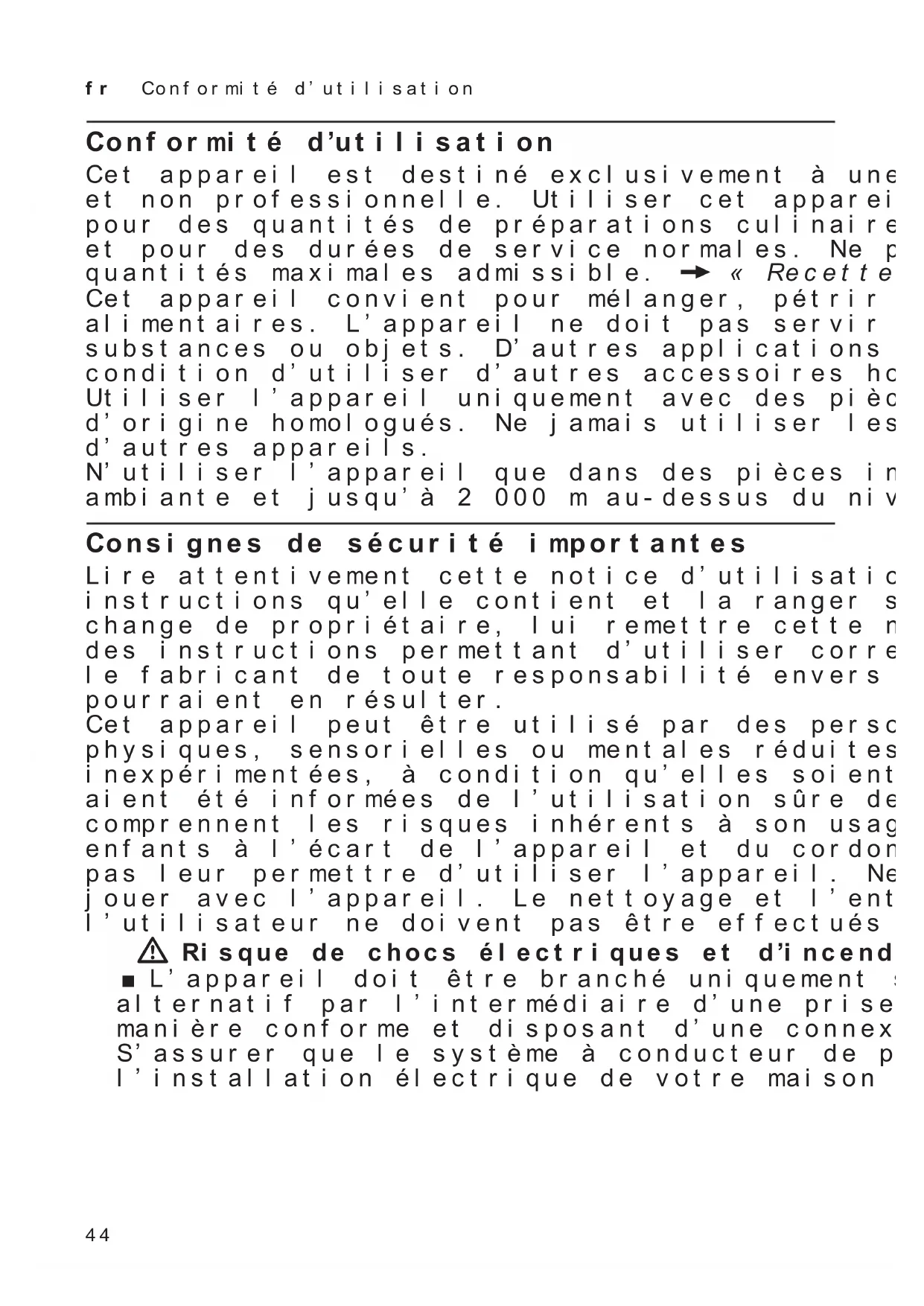 monter sur l’entraînement jaune avec orifice de sortie, p. ex. le râpeur. Important : ■ Respecter les marquages jaune, rouge ou noir sur l’entraînement et les accessoires. X « Code couleur » voir page 47 ■ Toujours recouvrir les entraînements qui ne servent pas avec des couvercles de protection. ■ Consulter les étapes suivantes dans la notice relative à l’accessoire correspondant. Nettoyage et entretien L’appareil et les ustensiles utilisés doivent être soigneusement nettoyés après chaque utilisation. X Figure N W Risque d’électrocution ! – Avant le nettoyage, débrancher la fiche mâle de la prise de courant. – Ne jamais plonger l’appareil de base dans des liquides et ne pas le laver au lave-vaisselle. – Ne jamais utiliser de nettoyeur à vapeur. Attention ! – Ne pas utiliser de produit nettoyant contenant de l’alcool ou de l’alcool à brûler. – Ne pas utiliser d’objets acérés, pointus ou métalliques. – Ne pas utiliser de chiffons abrasifs ou de produits nettoyants. – Ne pas coincer pas les pièces en plastique dans le lave-vaisselle, car elles risqueraient de se déformer de façon irréversible pendant le lavage ! Nettoyer l’appareil de base ■ Retirer le couvercle de protection de l’entraînement. ■ Essuyer l’appareil de base et les couvercles de protection des entraînements avec un chiffon doux humidifié, puis les sécher. Nettoyer le bol et les ustensiles ■ Nettoyer le bol, le couvercle et les ustensiles avec de l’eau savonneuse et un chiffon doux ou une éponge ou les mettre dans le lave-vaisselle. ■ Laisser sécher toutes les pièces. Recettes Crème chantilly – 200-1 500 g ■ Travailler la crème avec le fouet batteur pro pendant 1 ½ à 4 minutes (suivant la quantité et les propriétés de la crème) au niveau 7. Remarque : utiliser le programme automatique avec les modèles SensorControl Plus. X « Utilisation de SensorControl Plus » voir page 53 Blancs d’œufs – 2-12 blancs d’œufs ■ Travailler les blancs d’œufs avec le fouet batteur pro pendant 4 à 6 minutes au niveau 7. Remarque : utiliser le programme automatique avec les modèles SensorControl Plus. X « Utilisation de SensorControl Plus » voir page 5358 fr Recettes Pâte génoise Recette de base – 3 œufs – 3-4 cuillères à soupe d’eau très chaude – 150 g de sucre – 1 sachet de sucre vanillé – 150 g de farine – 50 g de fécule – Eventuellement de la levure chimique ■ Battre les ingrédients (sauf la farine et la fécule) env. 4 à 6 minutes avec le fouet batteur pro au niveau 7 jusqu’à obtention d’une mousse ferme. ■ Tourner l’interrupteur rotatif sur le niveau 1 et incorporer par cuillerées la farine et la fécule préalablement passées au tamis en l’espace de ½ à 1 minute environ. Quantité maximale : 2 x la recette de base Pâte à cake Recette de base – 3-4 oeufs – 200-250 g de sucre – 1 pincée de sel – 1 sachet de sucre vanillé ou le zeste de ½ citron – 200-250 g de beurre ou de margarine (à température ambiante) – 500 g de farine – 1 sachet de levure chimique – 150 ml de lait ■ Mélanger tous les ingrédients avec le fouet mixeur « Profi Flexi » pendant env. ½ minute au niveau 2, puis env. 2 à 3 minutes au niveau 7. Quantité maximale : 2,5 x la recette de base Pâte sablée Recette de base – 125 g de beurre (à température ambiante) – 100-125 g de sucre – 1 œuf – 1 pincée de sel – Un peu de zeste de citron ou de sucre vanillé – 250 g de farine – Eventuellement de la levure chimique ■ Travailler tous les ingrédients avec le fouet mixeur « Profi Flexi » pendant env. ½ minute au niveau 2, puis env. 2 à 3 minutes au niveau 6. A partir de 500 g de farine : ■ Pétrir les ingrédients avec le crochet pétrisseur pendant env. ½ minute au niveau 1, puis env. 3 à 4 minutes au niveau 3. Quantité maximale : 4 x la recette de base Pâte levée Recette de base – 500 g de farine – 1 œuf – 80 g de matière grasse (à température ambiante) – 80 g de sucre – 200-250 ml de lait tiède – 25 g de levure de boulanger fraîche ou 1 sachet de levure – Le zeste d’½ citron – 1 pincée de sel ■ Travailler tous les ingrédients avec le crochet pétrisseur pendant env. ½ minute au niveau 1, puis env. 3 à 6 minutes au niveau 3. Quantité maximale : 3 x la recette de base Remarque : utiliser le programme automatique avec les modèles SensorControl Plus. X « Utilisation de SensorControl Plus » voir page 53 Pâte à pâtes Recette de base – 500 g de farine – 250 g d’œufs (5 œufs environ) – 2 à 3 cuillères à soupe (20 à 30 g) d’eau froide, selon les besoins ■ Travailler tous les ingrédients pendant env. 3 à 5 minutes au niveau 3 jusqu’à obtention d’une pâte homogène. Quantité maximale : 1,5 x la recette de base59 fr Ajustage fin des ustensiles Pâte à pain Recette de base – 1000 g de farine – 3 sachets de levure de boulanger – 2 c. à c. de sel – 660 ml d’eau tiède ■ Travailler tous les ingrédients avec le crochet pétrisseur pendant env. ½ minute au niveau 1, puis env