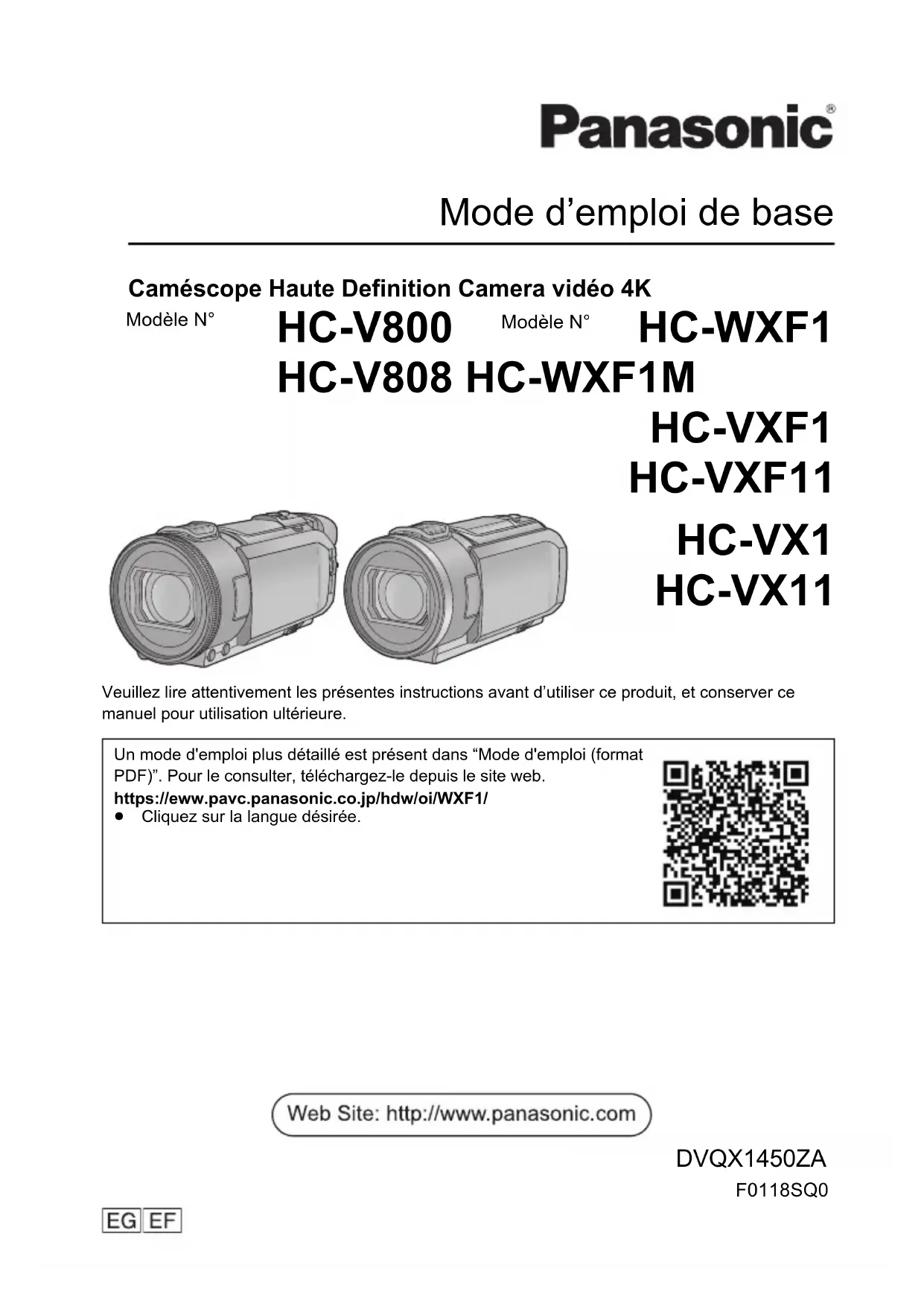 ≥ DLNA, le logo DLNA et DLNA CERTIFIED sont des marques de commerce, des marques de service ou des marques de certification de la Digital Living Network Alliance. ≥ QR Code est une marque déposée de DENSO WAVE INCORPORATED. ≥ Les autres noms de systèmes et produits mentionnés dans ce manuel d’utilisation sont habituellement des marques déposées ou des marques de commerce des fabricants qui ont développé le système ou le produit intéressé. Ce produit est placé sous la licence du portefeuille de brevets AVC pour l'utilisation personnelle du consommateur ou d'autres utilisations ne prévoyant aucune forme de rémunération pour (i) encoder des vidéos en conformité avec la norme (“ AVC Video ”) et (ou) (ii) décoder des vidéos AVC qui ont été encodées par un consommateur engagé dans une activité personnelle et (ou) qui ont été obtenues auprès d'un fournisseur vidéo autorisé à fournir des vidéos AVC. Aucune licence ne sera accordée ou ne sera impliquée dans une toute autre utilisation. Des informations supplémentaires peuvent être obtenues auprès de MPEG LA, L.L.C. Visiter http://www.mpegla.com Autres À propos des droits d’auteur HC-WXF1-VXF1-VX1-V800EGEF-DVQX1450_fre.book 42 ページ 2018年1月18日 木曜日 午後8時41分43 (FRE) DVQX1450 Ce produit comprend les logiciels suivants : (1) le logiciel développé indépendamment par ou pour Panasonic Corporation, (2) le logiciel appartenant à une tiers partie et sous licence Panasonic Corporation, (3) le logiciel sous licence GNU General Public License, Version 2.0 (GPL V2.0), (4) le logiciel sous licence GNU LESSER General Public License, Version 2.1 (LGPL V2.1), et/ou (5) le logiciel open source autre que le logiciel sous licence GPL V2.0 et/ou LGPL V2.1. Les logiciels catégorisés en tant que (3) - (5) sont distribués en espérant qu'ils seront utiles mais SANS AUCUNE GARANTIE, même tacite, de QUALITÉ MARCHANDE ou de PERTINENCE À DES FINS PARTICULIÈRES. Consultez-en les conditions générales, qui peuvent être affichées en suivant la procédure décrite dans [INFO LOGICIEL] sous "Utilisation du menu de configuration" dans le manuel d'utilisation (format PDF). Pendant au moins trois (3) ans à compter de la livraison de ce produit, Panasonic donnera à tout tiers qui nous contactera aux coordonnées fournies, pour un tarif n'excédant pas le coût physique de la réalisation de la distribution du code source, une copie sous forme lisible par un ordinateur, du code source intégral correspondant sous couvert de la GPL V2.0 ou de la LGPL V2.1, ainsi que les notices des droits d'auteur correspondantes. Contact : oss-cd-request@gg.jp.panasonic.com Le code source et la notice de droits d'auteur sont disponibles gratuitement sur notre site web suivant. https://panasonic.net/cns/oss/index.html HC-WXF1-VXF1-VX1-V800EGEF-DVQX1450_fre.book 43 ページ 2018年1月18日 木曜日 午後8時41分Panasonic Corporation Web site: http://www.panasonic.com © Panasonic Corporation 2018 Manufactured by: Panasonic Corporation Kadoma, Osaka, Japan Importer for Europe: Panasonic Marketing Europe GmbH Panasonic Testing Centre Winsbergring 15, 22525 Hamburg, Germany