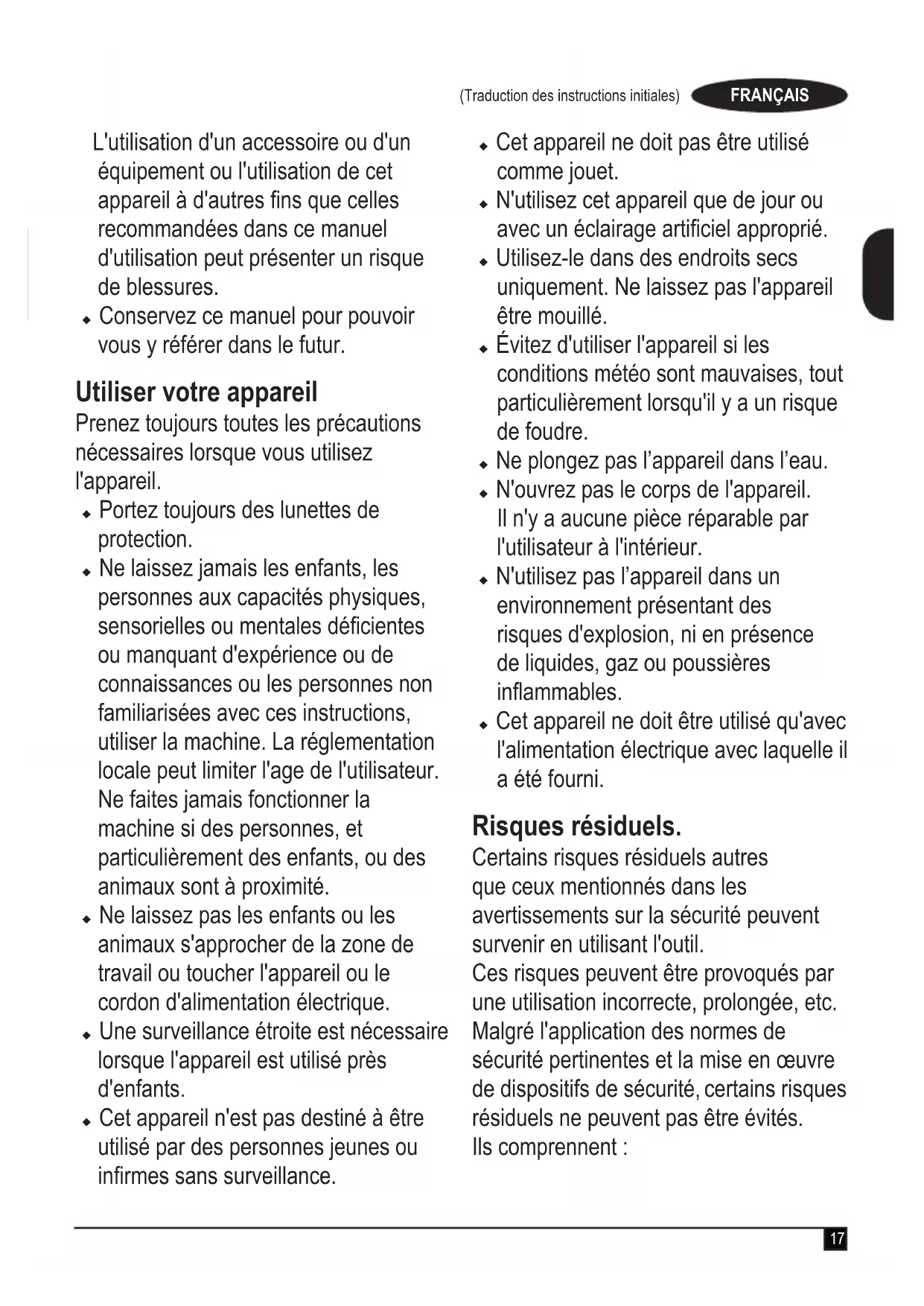 Utilisation prévue Vos soufeurs BLACK+DECKER BCBL200 L, BCBL200 L25 et BCBL200 B ont été conçus pour éliminer les feuilles. Ces appareils sont destinés à un usage grand public uniquement. Consignes de sécurité Avertissement ! De simples précautions sont à prendre pour l’utilisation d’appareil sans l ou branché à l’alimentation principale. Les conseils suivants doivent toujours être appliqués, ceci an de réduire le risque d’incendie, les chocs électriques, les blessures et les dommages matériels. u Lisez attentivement l'intégralité de ce manuel avant d’utiliser l’appareil. u Ce manuel décrit la manière d’utiliser ces appareils.17 (Traduction des instructions initiales) FRANÇAIS L'utilisation d'un accessoire ou d'un équipement ou l'utilisation de cet appareil à d'autres ns que celles recommandées dans ce manuel d'utilisation peut présenter un risque de blessures. u Conservez ce manuel pour pouvoir vous y référer dans le futur. Utiliser votre appareil Prenez toujours toutes les précautions nécessaires lorsque vous utilisez l'appareil. u Portez toujours des lunettes de protection. u Ne laissez jamais les enfants, les personnes aux capacités physiques, sensorielles ou mentales décientes ou manquant d'expérience ou de connaissances ou les personnes non familiarisées avec ces instructions, utiliser la machine. La réglementation locale peut limiter l'age de l'utilisateur. Ne faites jamais fonctionner la machine si des personnes, et particulièrement des enfants, ou des animaux sont à proximité. u Ne laissez pas les enfants ou les animaux s'approcher de la zone de travail ou toucher l'appareil ou le cordon d'alimentation électrique. u Une surveillance étroite est nécessaire lorsque l'appareil est utilisé près d'enfants. u Cet appareil n'est pas destiné à être utilisé par des personnes jeunes ou inrmes sans surveillance. u Cet appareil ne doit pas être utilisé comme jouet. u N'utilisez cet appareil que de jour ou avec un éclairage articiel approprié. u Utilisez-le dans des endroits secs uniquement. Ne laissez pas l'appareil être mouillé. u Évitez d'utiliser l'appareil si les conditions météo sont mauvaises, tout particulièrement lorsqu'il y a un risque de foudre. u Ne plongez pas l’appareil dans l’eau. u N'ouvrez pas le corps de l'appareil. Il n'y a aucune pièce réparable par l'utilisateur à l'intérieur. u N'utilisez pas l’appareil dans un environnement présentant des risques d'explosion, ni en présence de liquides, gaz ou poussières inammables. u Cet appareil ne doit être utilisé qu'avec l'alimentation électrique avec laquelle il a été fourni. Risques résiduels. Certains risques résiduels autres que ceux mentionnés dans les avertissements sur la sécurité peuvent survenir en utilisant l'outil. Ces risques peuvent être provoqués par une utilisation incorrecte, prolongée, etc. Malgré l'application des normes de sécurité pertinentes et la mise en œuvre de dispositifs de sécurité, certains risques résiduels ne peuvent pas être évités. Ils comprennent :18 (Traduction des instructions initiales) FRANÇAIS u Les blessures provoquées par le contact avec des pièces rotatives/ mobiles. u Les blessures provoquées pendant le remplacement de pièces, de lames ou d'accessoires. u Les blessures dues à l'utilisation prolongée d'un outil. Lorsque vous utilisez un outil quel qu'il soit pendant de longues périodes, assurez-vous de faire des pauses régulières. u La diminution de l’acuité auditive. u Les risques pour la santé provoqués par l'inhalation des poussières générées pendant l'utilisation de votre outil (exemple : travail avec du bois, surtout le chêne, le hêtre et les panneaux en MDF) Après utilisation u Quand il n’est pas utilisé, l’appareil doit être rangé dans un endroit sufsamment aéré, sec et hors de portée des enfants. u Les enfants ne doivent pas avoir accès aux appareils rangés. u Quand l’appareil est rangé ou transporté dans un véhicule, il doit être installé dans le coffre ou correctement calé pour éviter les mouvements dus aux changements de direction ou de vitesse. Vérication et réparations u Avant utilisation, vériez que les pièces de l'appareil sont en bon état. Contrôlez l'absence de pièces cassées ou toutes autres anomalies susceptibles de nuire au bon fonctionnement de la machine. u N’utilisez pas l’appareil si une quelconque pièce est endommagée ou défectueuse. u Faites réparer ou remplacer les pièces défectueuses ou endommagées par un réparateur agréé. u Ne tentez jamais de retirer ou de remplacer des pièces autres que celles citées dans ce manuel. Consignes de sécurité supplémentaires relatives aux soufeurs Ce manuel décrit la manière d'utiliser l'appareil. L’utilisation d’un accessoire ou d’un équipement ou l’utilisation de cet appareil à d’autres ns que celles recommandées dans ce manuel d’instructions peut entraîner des blessures et/ou des dommages matériels. u Pour protéger vos pieds et vos jambes quand l'appareil est en marche, portez toujours des chaussures renforcées et un pantalon. u Éteignez toujours votre machine, laissez le ventilateur s'arrêter et retirez la batterie lorsque : u Vous laissez l’appareil sans surveillance. u Vous devez supprimer un bourrage. u Vous devez contrôler, régler, nettoyer ou réparer votre appareil.19 (Traduction des instructions initiales) FRANÇAIS u L’appareil se met à vibrer anormalement. u Ne placez pas l'arrivée ou la sortie d'air d'aspiration près de vos yeux ou de vos oreilles quand l'appareil est en marche. Ne soufez jamais de débris vers les éventuelles personnes alentour. u N'utilisez en aucun cas l’appareil sous la pluie et ne le laissez pas à l'extérieur par temps pluvieux. u Ne traversez pas des passages gravillonés quand votre appareil est en marche. Marchez toujours, ne courez jamais. u Ne reposez pas votre appareil sur les gr