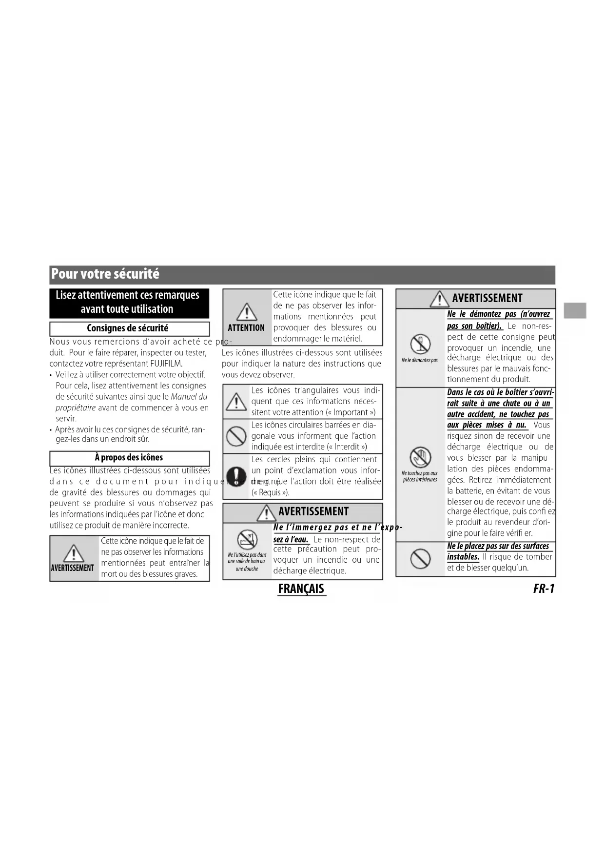 - distance from camera lens mount ange ⌀65.0 × 58.4 mm ⌀73.4 × 73.0 mm ⌀72.0 × 63.0 mm Weight* (approx.) * excluding caps and hoods 235 g 375 g 300 g Filter size ⌀58 mm ⌀67 mm ⌀62 mm Q Improvements may result in unannounced changes to specifi cations and appearance. Q Owing to how this lens is constructed, the “Distance indicator” displayed by the camera may in some cases diff er from the actual focus distance. Use the “Distance indicator” as a guide only.FR-1 FRANÇAIS Pour votre sécurité Lisez attentivement ces remarques avant toute utilisation Consignes de sécurité Nous vous remercions d’avoir acheté ce pro-duit. Pour le faire réparer, inspecter ou tester, contactez votre représentant FUJIFILM.• Veillez à utiliser correctement votre objectif. Pour cela, lisez attentivement les consignes de sécurité suivantes ainsi que le Manuel du propriétaire avant de commencer à vous en servir.• Après avoir lu ces consignes de sécurité, ran-gez-les dans un endroit sûr. À propos des icônes Les icônes illustrées ci-dessous sont utilisées dans ce document pour indiquer le degré de gravité des blessures ou dommages qui peuvent se produire si vous n’observez pas les informations indiquées par l’icône et donc utilisez ce produit de manière incorrecte.AVERTISSEMENTCette icône indique que le fait de ne pas observer les informations mentionnées peut entraîner la mort ou des blessures graves.ATTENTIONCette icône indique que le fait de ne pas observer les infor-mations mentionnées peut provoquer des blessures ou endommager le matériel.Les icônes illustrées ci-dessous sont utilisées pour indiquer la nature des instructions que vous devez observer.Les icônes triangulaires vous indi-quent que ces informations néces-sitent votre attention (« Important »)Les icônes circulaires barrées en dia-gonale vous informent que l’action indiquée est interdite (« Interdit »)Les cercles pleins qui contiennent un point d’exclamation vous infor-ment que l’action doit être réalisée (« Requis »). AVERTISSEMENT AVERTISSEMENT Ne l’utilisez pas dans une salle de bain ou une doucheNe l’immergez pas et ne l’expo-sez à l’eau. Le non-respect de cette précaution peut pro-voquer un incendie ou une décharge électrique. AVERTISSEMENT AVERTISSEMENT Ne le démontez pasNe le démontez pas (n’ouvrez pas son boîtier). Le non-res-pect de cette consigne peut provoquer un incendie, une décharge électrique ou des blessures par le mauvais fonc-tionnement du produit.Ne touchez pas aux pièces intérieuresDans le cas où le boîtier s’ouvri-rait suite à une chute ou à un autre accident, ne touchez pas aux pièces mises à nu. Vous risquez sinon de recevoir une décharge électrique ou de vous blesser par la manipu-lation des pièces endomma-gées. Retirez immédiatement la batterie, en évitant de vous blesser ou de recevoir une dé-charge électrique, puis confi ez le produit au revendeur d’ori-gine pour le faire vérifi er.Ne le placez pas sur des surfaces instables. Il risque de tomber et de blesser quelqu’un.FR-2 FRANÇAIS AVERTISSEMENT AVERTISSEMENT Ne regardez pas le soleil à travers l’objectif ou le viseur de l’appareil photo. Le non- respect de cette précaution pourrait entraîner une défi - cience visuelle permanente. ATTENTION ATTENTION Ne l’utilisez pas et ne le rangez pas dans des lieux exposés à la vapeur, à la fumée ou qui sont très humides ou poussiéreux. Le non-respect de cette consigne peut provoquer un incendie ou une décharge électrique Ne le laissez pas en plein soleil ou dans des endroits exposés à des températures très élevées, comme dans un véhicule fermé par grand soleil. Le non-res- pect de cette consigne peut provoquer un incendie ATTENTION ATTENTION Conservez-le hors de la portée des enfants en bas âge. Il peut provoquer des blessures s’il est laissé dans les mains d’un enfant. Ne le manipulez pas avec des mains mouillées. Vous risquez sinon de recevoir un choc électrique. Lorsque vous photographiez un sujet à contre-jour, gardez le soleil à l’extérieur du cadre. Les rayons du soleil focalisés dans l’appareil photo lorsque le so- leil est à l’intérieur ou près du cadre peuvent provoquer des feux ou des brûlures. Remettez les bouchons en place et rangez-le à l’abri du soleil lorsque vous ne l’utilisez pas. Les rayons du soleil focalisés par l’objectif peuvent provo- quer des feux ou des brûlures. ATTENTION ATTENTION Ne transportez pas l’appareil photo ou l’objectif lorsqu’ils sont xés sur un trépied. Ils peuvent tomber ou taper d’autres ob- jets et blesser quelqu’un. À l’attention des clients résidant aux États-Unis À l’attention des clients résidant aux États-Unis Testé pour être en conformité avec les normes de la FCC POUR UNE UTILISATION RÉSIDENTIELLE OU DE BUREAU Réglementation de la FCC : Cet appareil est conforme à la