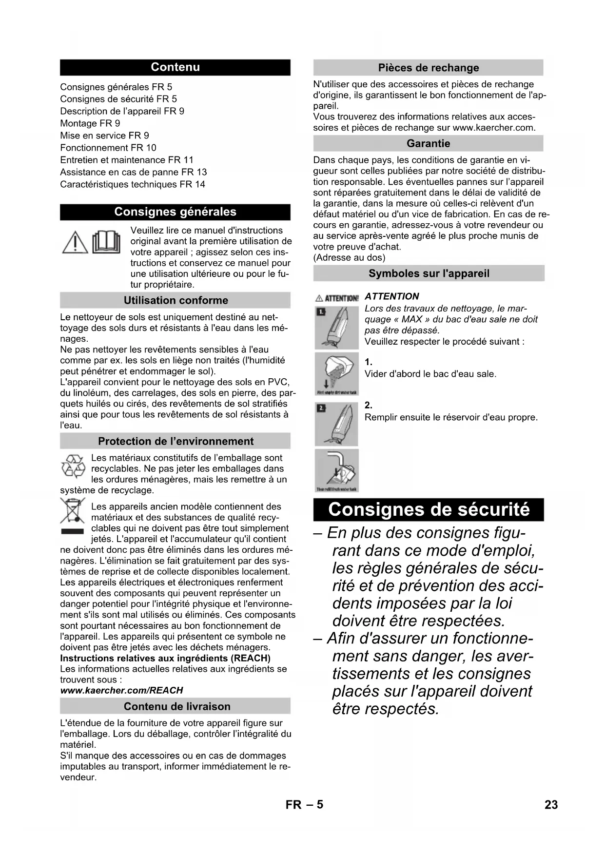 min Charging time for empty battery 4 h Charger initial voltage: 30 V Output current, charger 0,6 A Performance data Roller revolutions per minute 500 rpm Filling quantity Fresh water tank 400 ml Cleaning station 200 ml Dimensions Weight (without accessories and cleaning fluids) 4,4 kg Length 320 mm Width 270 mm Height 1220 mm Cable length Charger 1500 mm 22 EN– 5 Veuillez lire ce manuel d'instructions original avant la première utilisation de votre appareil ; agissez selon ces ins- tructions et conservez ce manuel pour une utilisation ultérieure ou pour le fu- tur propriétaire. Le nettoyeur de sols est uniquement destiné au net- toyage des sols durs et résistants à l'eau dans les mé- nages. Ne pas nettoyer les revêtements sensibles à l'eau comme par ex. les sols en liège non traités (l'humidité peut pénétrer et endommager le sol). L'appareil convient pour le nettoyage des sols en PVC, du linoléum, des carrelages, des sols en pierre, des par- quets huilés ou cirés, des revêtements de sol stratifiés ainsi que pour tous les revêtements de sol résistants à l'eau. Les matériaux constitutifs de l’emballage sont recyclables. Ne pas jeter les emballages dans les ordures ménagères, mais les remettre à un système de recyclage. Les appareils ancien modèle contiennent des matériaux et des substances de qualité recy- clables qui ne doivent pas être tout simplement jetés. L'appareil et l'accumulateur qu'il contient ne doivent donc pas être éliminés dans les ordures mé- nagères. L'élimination se fait gratuitement par des sys- tèmes de reprise et de collecte disponibles localement. Les appareils électriques et électroniques renferment souvent des composants qui peuvent représenter un danger potentiel pour l'intégrité physique et l'environne- ment s'ils sont mal utilisés ou éliminés. Ces composants sont pourtant nécessaires au bon fonctionnement de l'appareil. Les appareils qui présentent ce symbole ne doivent pas être jetés avec les déchets ménagers. Instructions relatives aux ingrédients (REACH) Les informations actuelles relatives aux ingrédients se trouvent sous : www.kaercher.com/REACH L'étendue de la fourniture de votre appareil figure sur l'emballage. Lors du déballage, contrôler l’intégralité du matériel. S'il manque des accessoires ou en cas de dommages imputables au transport, informer immédiatement le re- vendeur. N'utiliser que des accessoires et pièces de rechange d'origine, ils garantissent le bon fonctionnement de l'ap- pareil. Vous trouverez des informations relatives aux acces- soires et pièces de rechange sur www.kaercher.com. Dans chaque pays, les conditions de garantie en vi- gueur sont celles publiées par notre société de distribu- tion responsable. Les éventuelles pannes sur l’appareil sont réparées gratuitement dans le délai de validité de la garantie, dans la mesure où celles-ci relèvent d'un défaut matériel ou d'un vice de fabrication. En cas de re- cours en garantie, adressez-vous à votre revendeur ou au service après-vente agréé le plus proche munis de votre preuve d'achat. (Adresse au dos) – En plus des consignes figu- rant dans ce mode d'emploi, les règles générales de sécu- rité et de prévention des acci- dents imposées par la loi doivent être respectées. – Afin d'assurer un fonctionne- ment sans danger, les aver- tissements et les consignes placés sur l'appareil doivent être respectés. Contenu Consignes générales FR 5 Consignes de sécurité FR 5 Description de l’appareil FR 9 Montage FR 9 Mise en service FR 9 Fonctionnement FR 10 Entretien et maintenance FR 11 Assistance en cas de panne FR 13 Caractéristiques techniques FR 14 Consignes générales Utilisation conforme Protection de l’environnement Contenu de livraison Pièces de rechange Garantie Symboles sur l'appareil ATTENTION Lors des travaux de nettoyage, le mar- quage « MAX » du bac d'eau sale ne doit pas être dépassé. Veuillez respecter le procédé suivant :