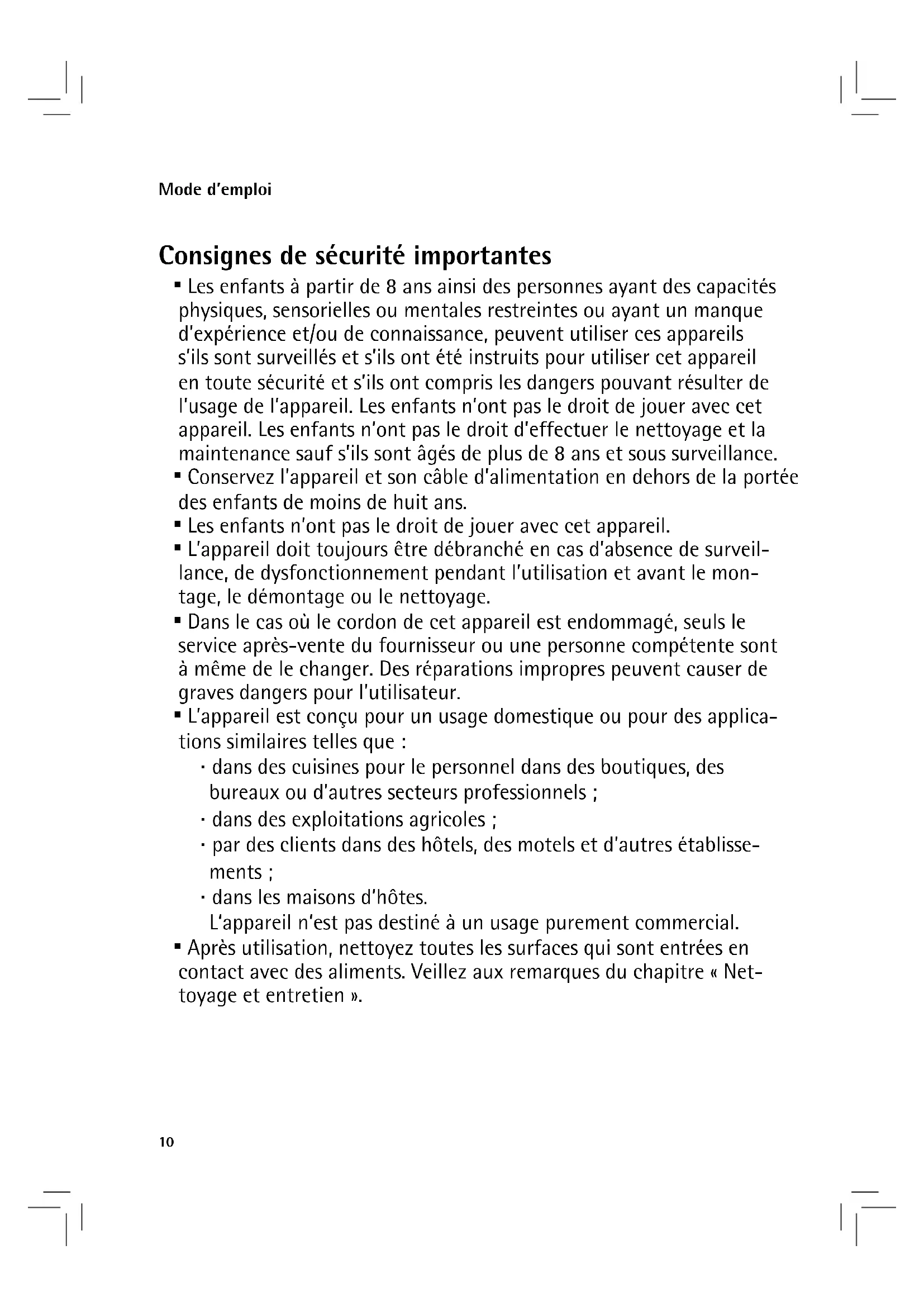 - Les enfants à partir de 8 ans ainsi des personnes ayant des capacité physiques, sensorielles ou mentales restreintes ou ayant un manque d'expérience et/ou de connaissance, peuvent utiliser ces apparêils s'ils sont surveillés et s'ils ont été instruits pour utiliser cet apparéil en toute sécurité et s'ils ont compris les dangers pouvant résultat de l'usage de l' apparéil. Les enfants n'ont pas le droit de jouer avec cet apparéil. Les enfants n'ont pas le droit d'effectuer le nettoyage et la maintenance sauf s'ils sont âgés de plus de 8 ans et sous surveillance.