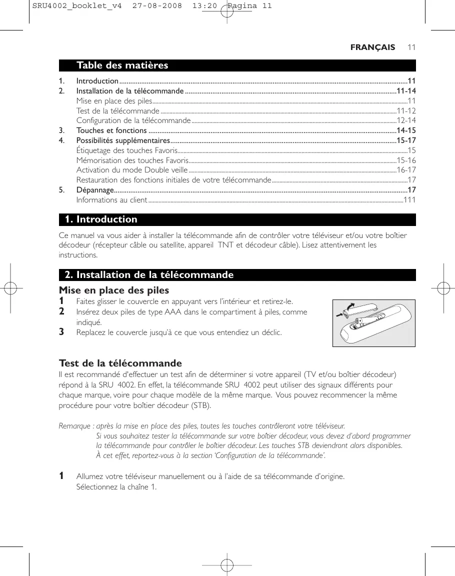 indiqué. Replacez le couvercle jusqu’à ce que vous entendiez un déclic. Test de la télécommande Il est recommandé d'effectuer un test afin de déterminer si votre appareil (TV et/ou boîtier décodeur) répond à la SRU 4002. En effet, la télécommande SRU 4002 peut utiliser des signaux différents pour chaque marque, voire pour chaque modèle de la même marque. Vous pouvez recommencer la même procédure pour votre boîtier décodeur (STB). Remarque : après la mise en place des piles, toutes les touches contrôleront votre téléviseur. Si vous souhaitez tester la télécommande sur votre boîtier décodeur, vous devez d’abord programmer la télécommande pour contrôler le boîtier décodeur. Les touches STB deviendront alors disponibles. À cet effet, reportez-vous à la section ‘Configuration de la télécommande’.