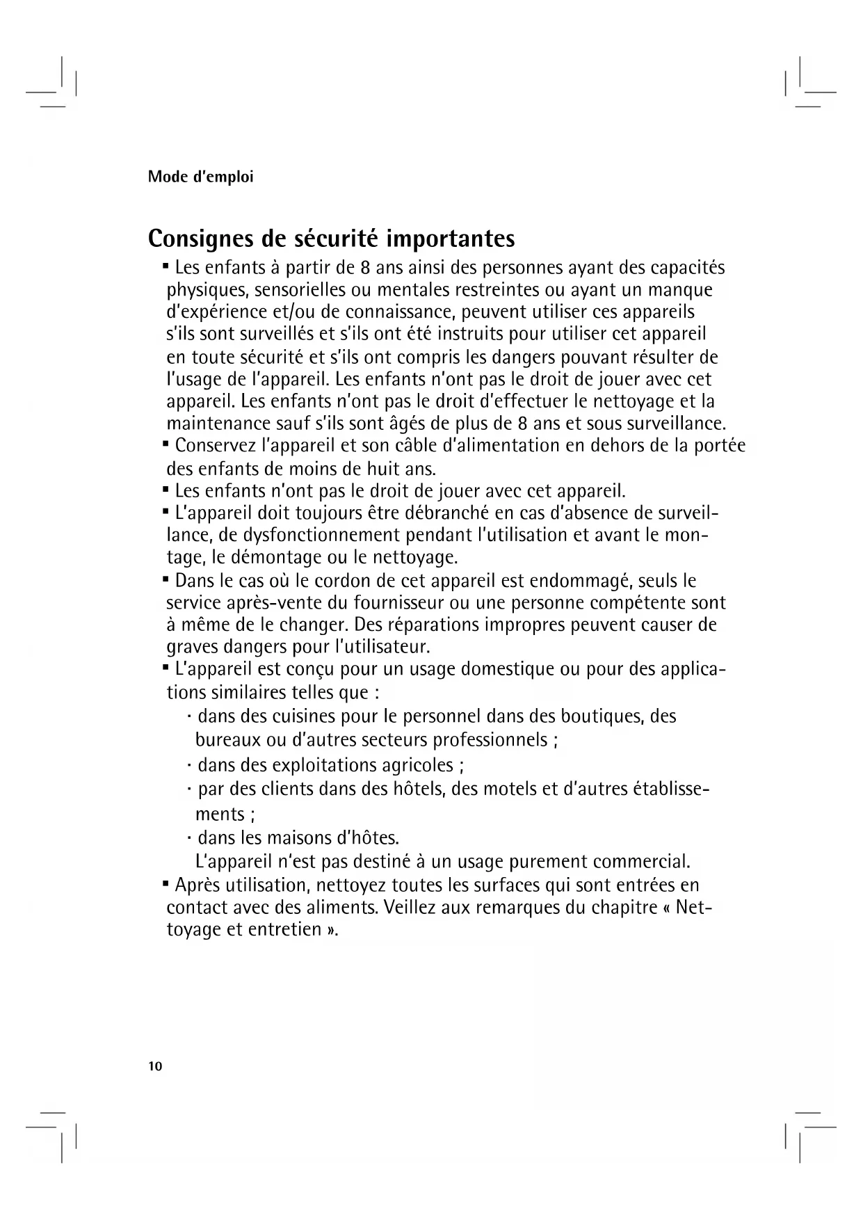 - Les enfants à partir de 8 ans ainsi des personnes ayant des capacité physiques, sensorielles ou mentales restreintes ou ayant un manque d'expérience et/ou de connaissance, peuvent utiliser ces apparêils s'ils sont surveillés et s'ils ont été instruits pour utiliser cet apparéil en toute sécurité et s'ils ont compris les dangers pouvant résultat de l'usage de l' apparéil. Les enfants n'ont pas le droit de jouer avec cet apparéil. Les enfants n'ont pas le droit d'effectuer le nettoyage et la maintenance sauf s'ils sont âgés de plus de 8 ans et sous surveillance.