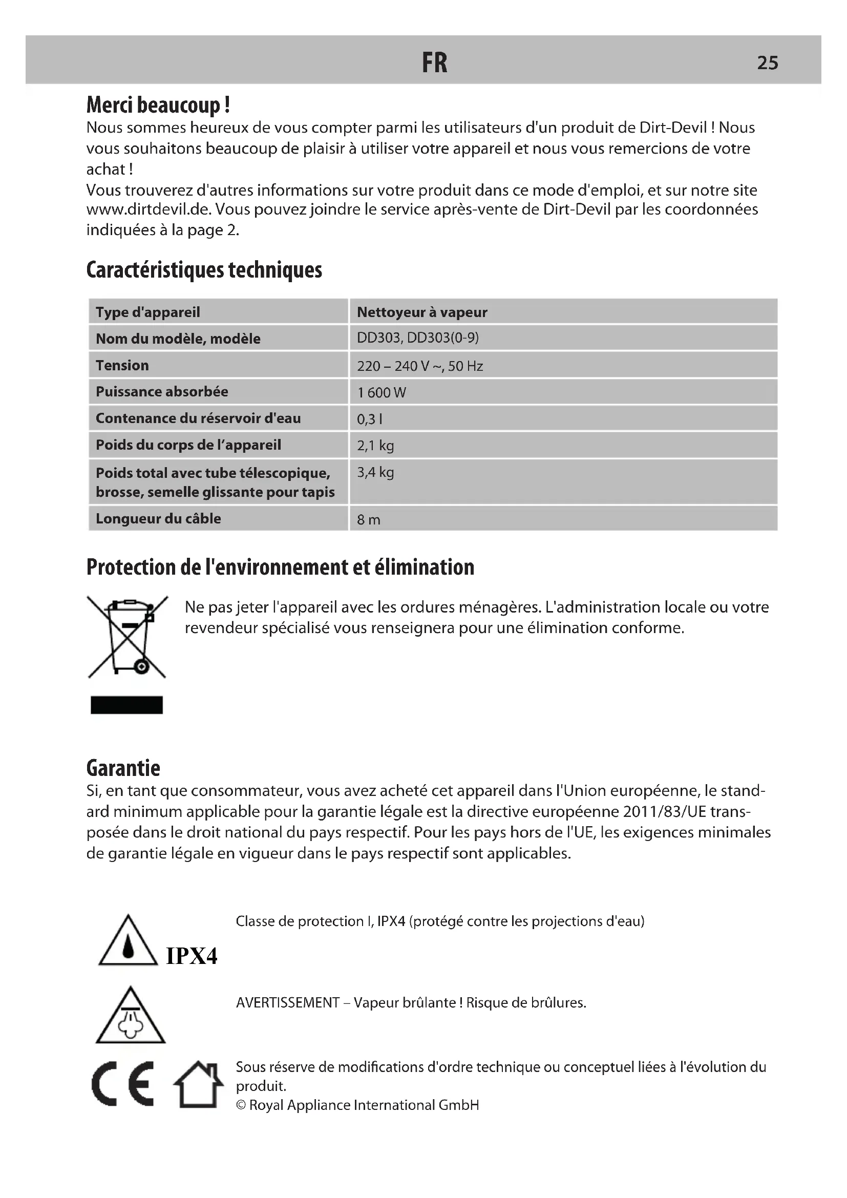 ENIPX4 Protection de l'environnement et élimination Ne pas jeter l'appareil avec les ordures ménagères. L'administration locale ou votre revendeur spécialisé vous renseignera pour une élimination conforme. Garantie Si, en tant que consommateur, vous avez acheté cet appareil dans l'Union européenne, le stand- ard minimum applicable pour la garantie légale est la directive européenne 2011/83/UE trans- posée dans le droit national du pays respectif. Pour les pays hors de l'UE, les exigences minimales de garantie légale en vigueur dans le pays respectif sont applicables. Sous réserve de modications d'ordre technique ou conceptuel liées à l'évolution du produit.© Royal Appliance International GmbH Merci beaucoup ! Nous sommes heureux de vous compter parmi les utilisateurs d'un produit de Dirt-Devil ! Nous vous souhaitons beaucoup de plaisir à utiliser votre appareil et nous vous remercions de votre achat ! Vous trouverez d'autres informations sur votre produit dans ce mode d'emploi, et sur notre site www.dirtdevil.de. Vous pouvez joindre le service après-vente de Dirt-Devil par les coordonnées indiquées à la page 2. Caractéristiques techniques Type d'appareilNettoyeur à vapeurNom du modèle, modèleDD303, DD303(0-9)Tension220 – 240 V ~, 50 HzPuissance absorbée1 600 WContenance du réservoir d'eau0,3 lPoids du corps de l’appareil2,1 kgPoids total avec tube télescopique, brosse, semelle glissante pour tapis3,4 kgLongueur du câble 8 m AVERTISSEMENT – Vapeur brûlante ! Risque de brûlures.Classe de protection I, IPX4 (protégé contre les projections d'eau)