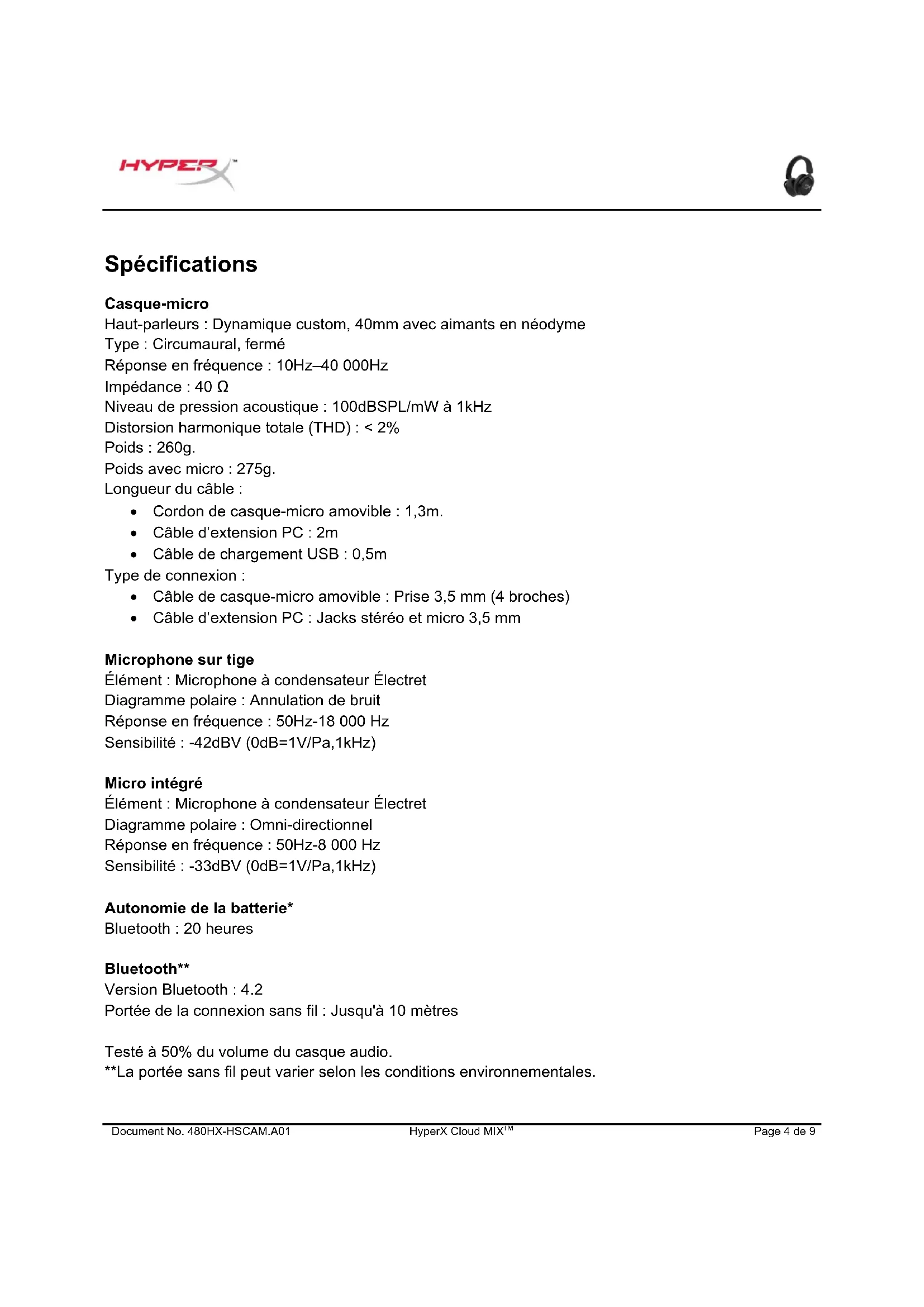 Page 4 de 9 Spécifications Casque-micro Haut-parleurs : Dynamique custom, 40mm avec aimants en néodyme Type : Circumaural, fermé Réponse en fréquence : 10Hz–40 000Hz Impédance : 40 Ω Niveau de pression acoustique : 100dBSPL/mW à 1kHz Distorsion harmonique totale (THD) : < 2% Poids : 260g. Poids avec micro : 275g. Longueur du câble : Cordon de casque-micro amovible : 1,3m. Câble d’extension PC : 2m Câble de chargement USB : 0,5m Type de connexion : Câble de casque-micro amovible : Prise 3,5 mm (4 broches) Câble d’extension PC : Jacks stéréo et micro 3,5 mm Microphone sur tige Élément : Microphone à condensateur Électret Diagramme polaire : Annulation de bruit Réponse en fréquence : 50Hz-18 000 Hz Sensibilité : -42dBV (0dB=1V/Pa,1kHz) Micro intégré Élément : Microphone à condensateur Électret Diagramme polaire : Omni-directionnel Réponse en fréquence : 50Hz-8 000 Hz Sensibilité : -33dBV (0dB=1V/Pa,1kHz) Autonomie de la batterie* Bluetooth : 20 heures Bluetooth** Version Bluetooth : 4.2 Portée de la connexion sans fil : Jusqu'à 10 mètres Testé à 50% du volume du casque audio. **La portée sans fil peut varier selon les conditions environnementales.Document No. 480HX-HSCAM.A01 HyperX Cloud MIX