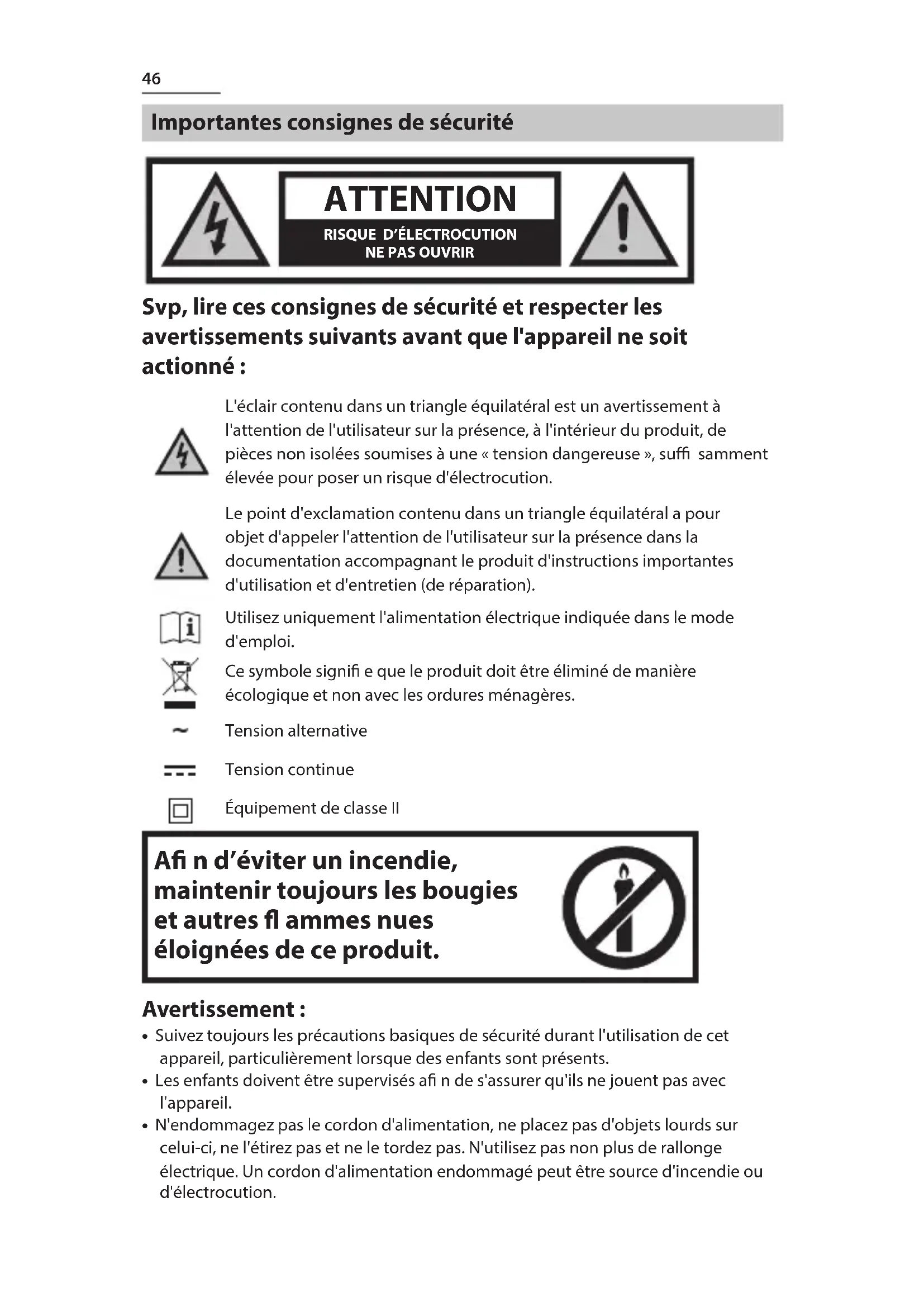 Svp, lire ces consignes de sécurité et respecter les avertissements suivants avant que l'appareil ne soit actionné : L'éclair contenu dans un triangle équilatéral est un avertissement à l'attention de l'utilisateur sur la présence, à l'intérieur du produit, de pièces non isolées soumises à une « tension dangereuse », suffi samment élevée pour poser un risque d'électrocution. Le point d'exclamation contenu dans un triangle équilatéral a pour objet d'appeler l'attention de l'utilisateur sur la présence dans la documentation accompagnant le produit d'instructions importantes d'utilisation et d'entretien (de réparation). Utilisez uniquement l'alimentation électrique indiquée dans le mode d'emploi. Ce symbole signi e que le produit doit être éliminé de manière écologique et non avec les ordures ménagères. Tension alternative Tension continue Équipement de classe II A n d’éviter un incendie, maintenir toujours les bougies et autres ammes nues éloignées de ce produit.