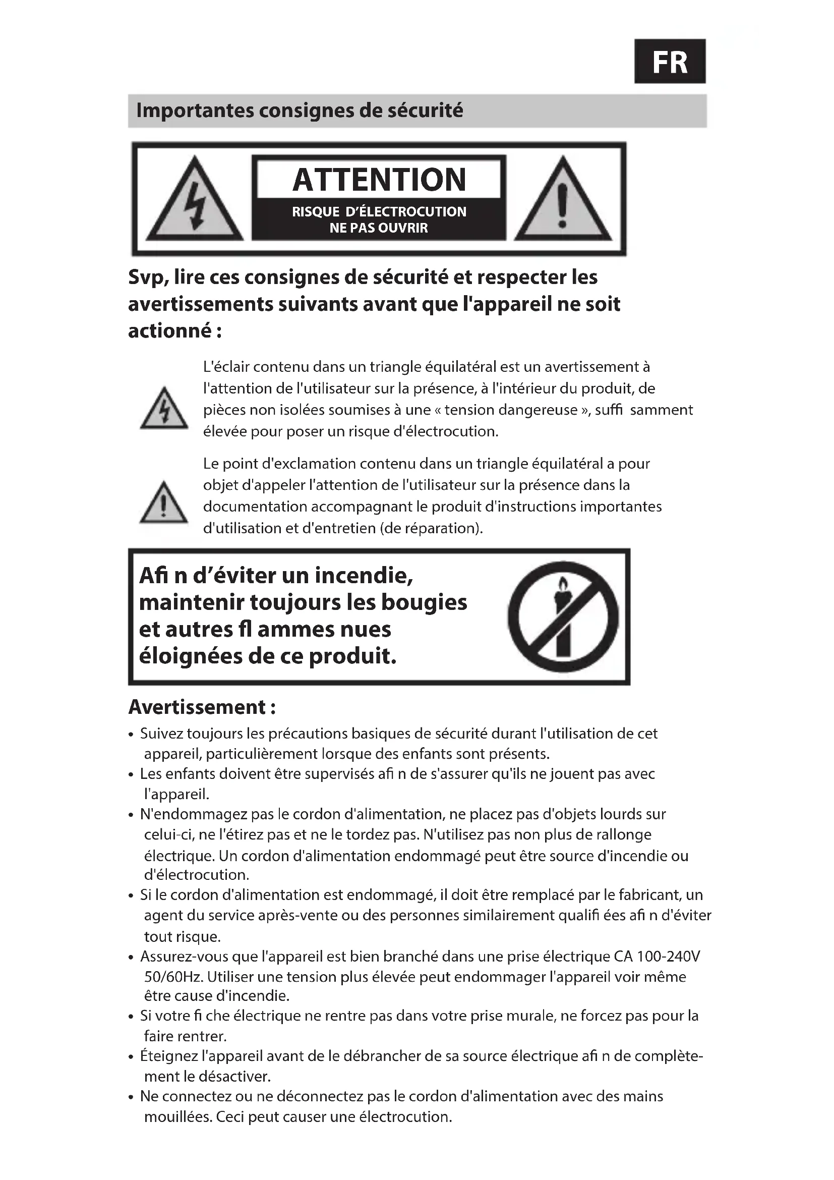 Svp, lire ces consignes de sécurité et respecter les avertissements suivants avant que l'appareil ne soit actionné : L'éclair contenu dans un triangle équilatéral est un avertissement à l'attention de l'utilisateur sur la présence, à l'intérieur du produit, de pièces non isolées soumises à une « tension dangereuse », suffi samment élevée pour poser un risque d'électrocution.Le point d'exclamation contenu dans un triangle équilatéral a pour objet d'appeler l'attention de l'utilisateur sur la présence dans la documentation accompagnant le produit d'instructions importantes d'utilisation et d'entretien (de réparation). A n d’éviter un incendie, maintenir toujours les bougies et autres ammes nues éloignées de ce produit.