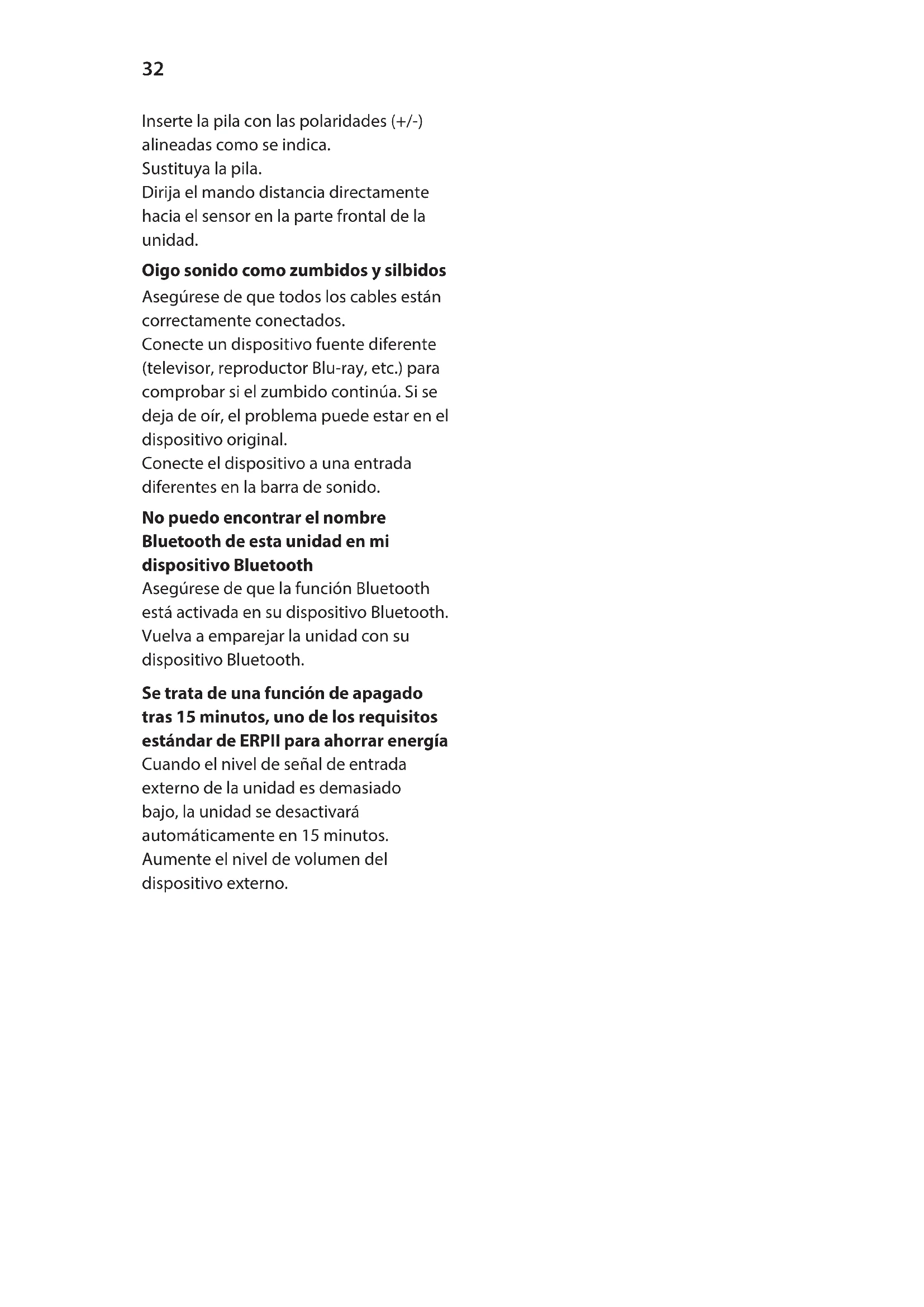 pour contrôler la lecture (si compatible AVRCP). – Pour mettre en pause ou reprendre la lecture, pressez la touche sur la télécommande. – Pour sauter une piste, pressez les tou- ches / sur la télécommande. Dépannage Pour conserver la validité de la garantie, n’essayez jamais de réparer le système par vous-même. En cas de problèmes durant l’utilisation de cette unité, référez- vous aux conseils ci-dessous avant de contacter le service après-vente. Le système ne s’allume pas. Assurez-vous que le cordon d’alimentation est correctement connecté. Assurez-vous que la prise murale est bien alimentée. Pressez la touche veille de la télécommande ou de la barre de son pour allumer la barre de son. Pas de son de la barre de son. Pressez MUTE sur la télécommande pour vous assurer que la barre de son n’est pas en sourdine. Pressez les touches de source pour sélectionner une autre source en entrée. Lorsque vous utilisez l’une des entrée numériques et si aucun son n’est audible : – Essayez de régler la sortie de votre TV en mode PCM ou – Connectez directement votre source Blu-ray ou autre, certaines télévisions ne laissant pas passer les signaux audio numériques. Vous TV peut être réglée en sortie audio variable. Con rmez que la sortie audio est réglée sur xe ou standard et non variable. Consultez le manuel d’utilisation de votre TV pour plus d’informations. Si vous utilisez la fonction Bluetooth, assurez-vous que le volume de votre appareil source est suffi samment élevé et que l’appareil n’est pas en sourdine. La télécommande ne fonctionne pas. Avant de presser toute touche de lecture, sélectionnez d’abord la source adéquate. Réduisez la distance entre la télécommande et l’unité. Insérez la pile en respectant les polarités (+/-) indiquées. Remplacez la pile. Pointez la télécommande directement sur le détecteur sur la partie avant de l’appareil. Un bourdonnement est audible Assurez-vous que tous les câbles sont correctement connectés. Connectez un autre appareil source (TV. lecteur Blu-ray, etc.) pour véri er sur le bourdonnement persiste. Si ce n’est pas le cas, le problème peut être issu de l’appareil initial. Connectez votre appareil à une diff érente entrée de la barre de son. Je ne peux pas trouver le nom Bluetooth de cette unité sur mon appareil Bluetooth Assurez-vous que la fonction Bluetooth est activée sur votre appareil Bluetooth.FR Appariez votre appareil Bluetooth à nouveau. Il existe une fonction de mise à l’arrêt après 15 mins, celle-ci étant l’une des exigences du standard ERPII d’économies d’énergie. Lorsque le signal d’entrée externe de l’unité est trop faible, l’unité s’éteint automatiquement après 15 minutes. Veuillez augmenter le niveau sonore de votre appareil externe. Écouter de la musique depuis un appareil Bluetooth – Si l‘appareil Bluetooth connecté est compatible avec Advanced Audio Dis- tribution Pro le (A2DP), vous pouvez écouter la musique stockée sur l‘appa- reil sur la barre de son. – Si l‘appareil est aussi compatible avec Audio Video Remote Control Pro le (AVRCP), vous pouvez utiliser la télé- commande de la barre de son pour lire la musique stockée sur l‘appareil.