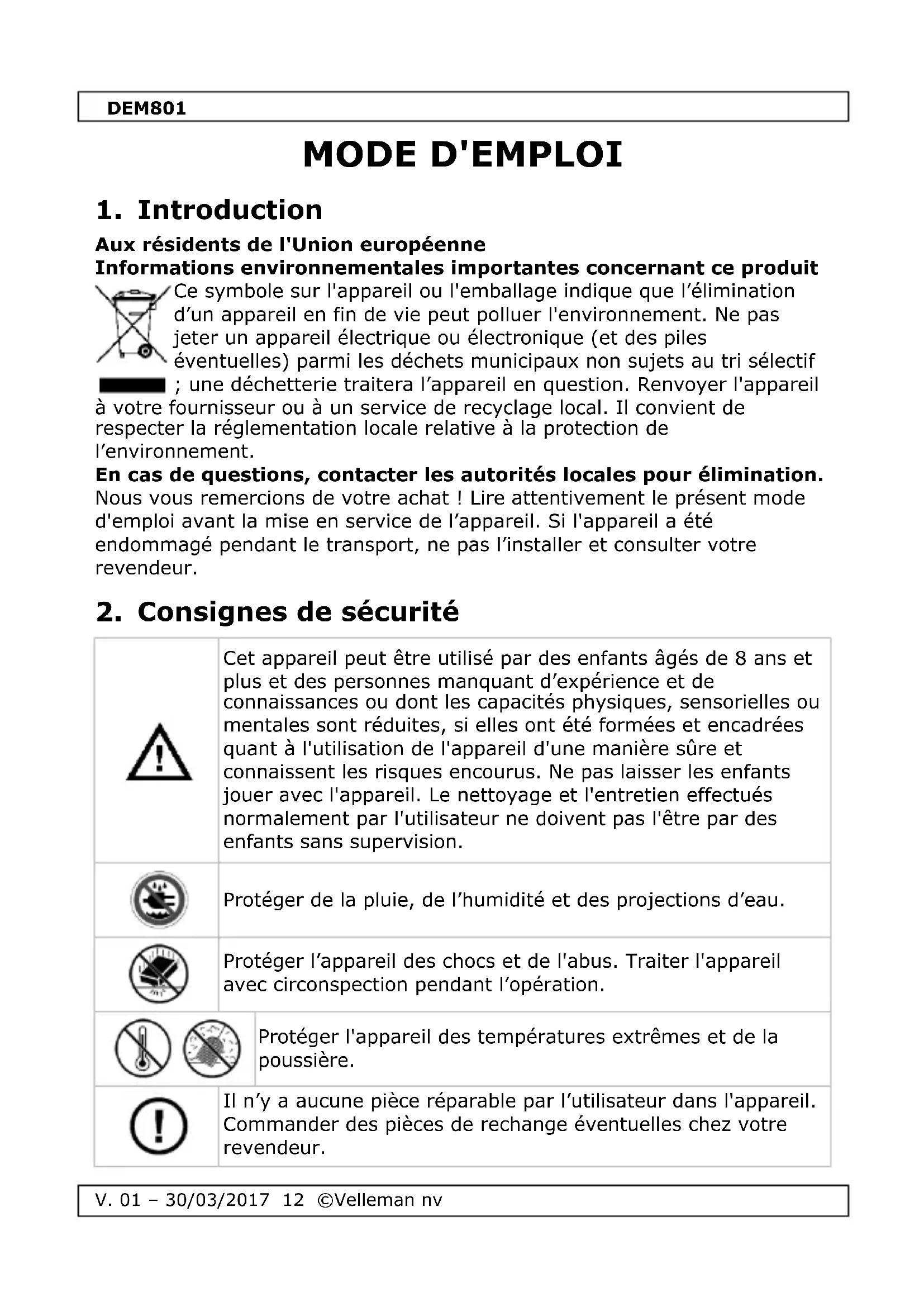 Retrouvez gratuitement la notice de l'appareil DEM801 VELLEMAN au format PDF.