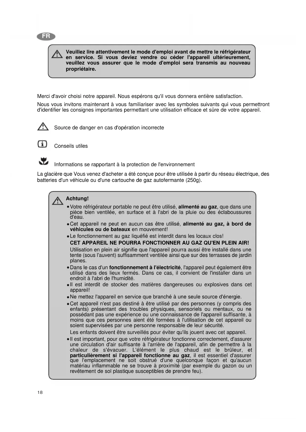 Merci d'avoir choisi notre appareil. Nous espérons qu'il vous donnera entière satisfaction. Nous vous invitons maintenant à vous familiariser avec les symboles suivants qui vous permettront d'identifier les consignes importantes permettant une utilisation efficace et sûre de votre appareil. Source de danger en cas d'opération incorrecte Conseils utiles Informations se rapportant à la protection de l'environnement La glacière que Vous venez d'acheter a été conçue pour être utilisée à partir du réseau électrique, des batteries d'un véhicule ou d'une cartouche de gaz autofermante (250g). Veuillez lire attentivement le mode d'emploi avant de mettre le réfrigérateur en service. Si vous deviez vendre ou céder l'appareil ultérieurement, veuillez vous assurer que le mode d'emploi sera transmis au nouveau propriétaire. Achtung! Votre réfrigérateur portable ne peut être utilisé, alimenté au gaz, que dans une pièce bien ventilée, en surface et à l'abri de la pluie ou des éclaboussures d'eau. Cet appareil ne peut en aucun cas être utilisé, alimenté au gaz, à bord de véhicules ou de bateaux en mouvement! Le fonctionnement au gaz liquéfié est interdit dans les locaux clos! CET APPAREIL NE POURRA FONCTIONNER AU GAZ QU'EN PLEIN AIR! Utilisation en plein air signifie que l'appareil pourra aussi être installé dans une tente (sous l'auvent) suffisamment ventilée ainsi que sur des terrasses de jardin planes. Dans le cas d'un fonctionnement à l'électricité, l'appareil peut également être utilisé dans des lieux fermés. Dans ce cas, il convient de l'installer dans un endroit à l'abri de l'humidité. Il est interdit de stocker des matières dangereuses ou explosives dans cet appareil! Ne mettez l'appareil en service que branché à une seule source d'énergie. Cet appareil n'est pas destiné à être utilisé par des personnes (y compris des enfants) présentant des troubles physiques, sensoriels ou mentaux, ou ne possédant pas une expérience ou une connaissance de l'appareil suffisante, à moins que ces personnes aient été formées à l'utilisation de cet appareil ou soient supervisées par une personne responsable de leur sécurité. Les enfants doivent être surveillés pour éviter qu'ils jouent avec cet appareil. Il est important, pour que votre réfrigérateur fonctionne correctement, d'assurer une circulation d'air suffisante à l'arrière de l'appareil, afin de permettre à la chaleur de s'évacuer. L'élément le plus chaud est le brûleur, et particulièrement si l'appareil fonctionne au gaz, il est essentiel d'assurer que l'emplacement ne soit obstrué d'une quelconque façon et qu'aucun matériau inflammable ne se trouve à proximité (par exemple du gazon ou un revêtement de sol plastique susceptibles de prendre feu).19