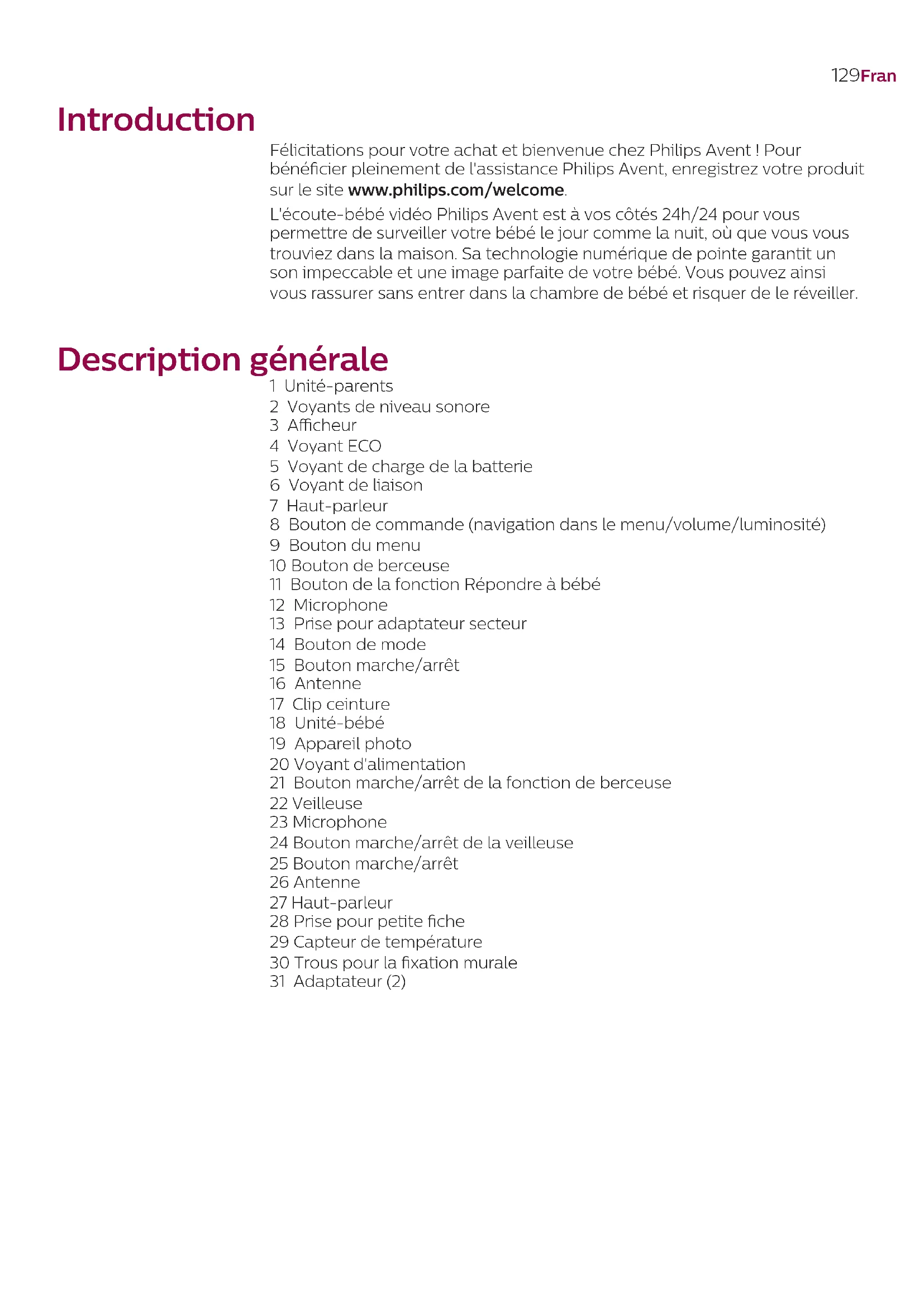 Félicitations pour votre achat et bienvenue chez Philips Avent! Pour bénéficier pleinement de l'assistance Philips Avent, enregistrez votre produit sur le site www.philips.com/welcome.