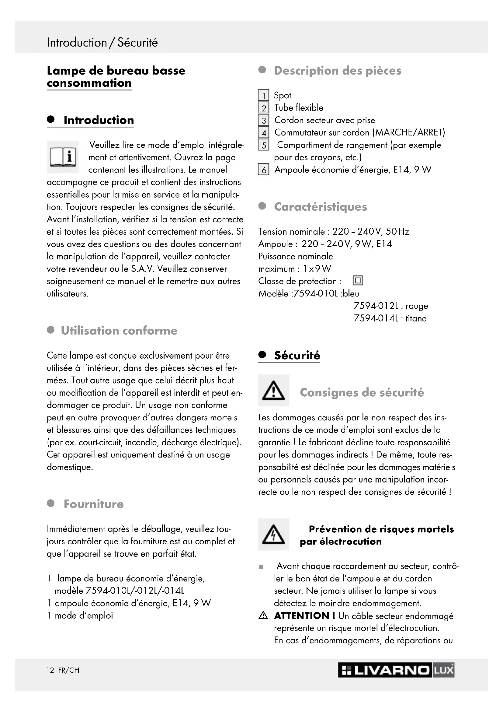 Sécurité Consignes de sécurité Les dommages causés par le non respect des ins- tructions de ce mode d‘emploi sont exclus de la garantie ! Le fabricant décline toute responsabilité pour les dommages indirects ! De même, toute res- ponsabilité est déclinée pour les dommages matériels ou personnels causés par une manipulation incor- recte ou le non respect des consignes de sécurité ! Prévention de risques mortels par électrocution J Avant chaque raccordement au secteur, contrô- ler le bon état de l‘ampoule et du cordon secteur. Ne jamais utiliser la lampe si vous détectez le moindre endommagement. m ATTENTION ! Un câble secteur endommagé représente un risque mortel d‘électrocution. En cas d‘endommagements, de réparations ou Introduction / Sécurité13 FR/CH d‘autres problèmes, veuillez contacter la filiale S.A.V. ou un électricien. J Absolument éviter tout contact de la lampe avec de l‘eau ou d‘autres liquides. J N‘ouvrez jamais un élément électrique (par exemple commutateur à fil et autres), et n‘insé- rez aucuns objets à l‘intérieur. De telles actions impliquent un danger de mort par électrocution. J Pour éviter des dangers, si une ligne électrique flexible extérieure de cette lampe est endom- magée, ne la faire remplacer exclusivement que par le fabricant, son représentant S.A.V. ou un spécialiste comparable. Prévention de risque d‘incendies et de blessures J RISQUE DE BLESSURES ! Immédiatement après avoir sorti la lampe de l’emballage, contrôlez-la et contrôlez chacune des ampoules afin de détecter d’éventuels endommagements. Ne montez pas la lampe avec des ampoules défectueuses. Dans ce cas, prenez contact avec le point S.A.V. pour les remplacer. J RISQUE DE BRÛLURE ! Afin d‘éviter toutes brûlures, vérifiez que la lampe est éteinte et suffisamment froide avant de la manipuler. L‘ampoule dégage une forte chaleur dans la tête de la lampe. J Avant de remplacer une ampoule défectueuse, laissez la lampe refroidir complètement. J Remplacez immédiatement l‘ampoule lorsqu‘elle est usée. Avant de changer l‘am- poule, débranchez toujours la prise. J Ne laissez pas sans surveillance la lampe en service. Un développement de chaleur excessif peut entraîner un incendie. J Ne pas laisser la lampe ou le matériel d‘em- ballage traîner négligemment. Les films et les sachets en plastique, les éléments en matières synthétiques, etc. peuvent devenir des jouets dangereux dans les mains des enfants. J Ne recouvrez pas la lampe. Pour travailler en toute sécurité J Utilisez uniquement des ampoules économie d’énergie de 220 – 240 Volt E14 d’une puis- sance maximale de 9 Watts. J Placez la lampe de telle sorte qu’elle soit protégée de l’humidité et de la saleté.