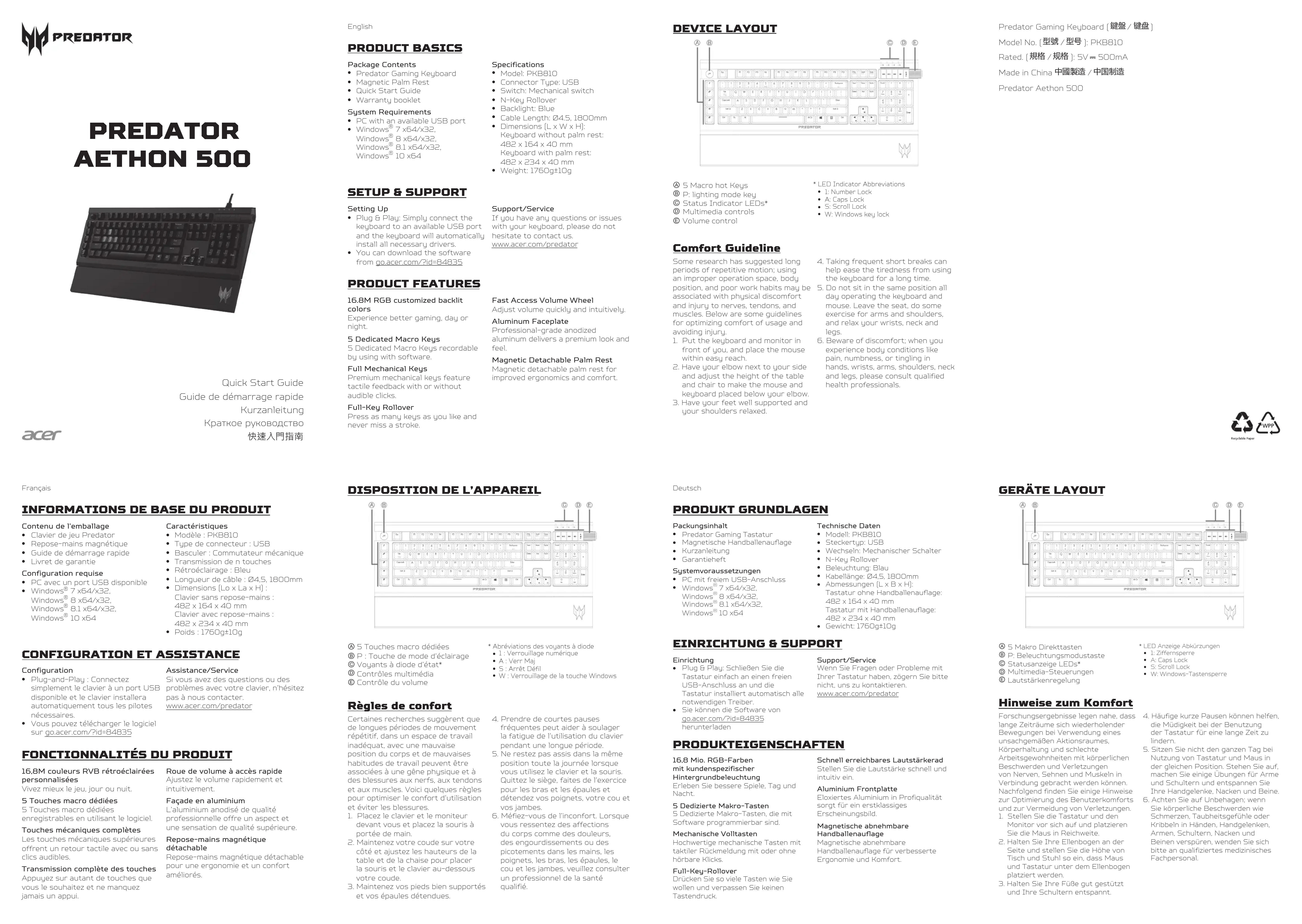 vous ressentez des affections du corps comme des douleurs, des engourdissements ou des picotements dans les mains, les poignets, les bras, les épaules, le cou et les jambes, veuillez consulter un professionnel de la santé qualifié. Deutsch PRODUKT GRUNDLAGEN Packungsinhalt Predator Gaming Tastatur Magnetische Handballenauflage Kurzanleitung GarantieheftSystemvoraussetzungen PC mit freiem USB-Anschluss Windows 7 x64/x32, Windows 8 x64/x32, Windows