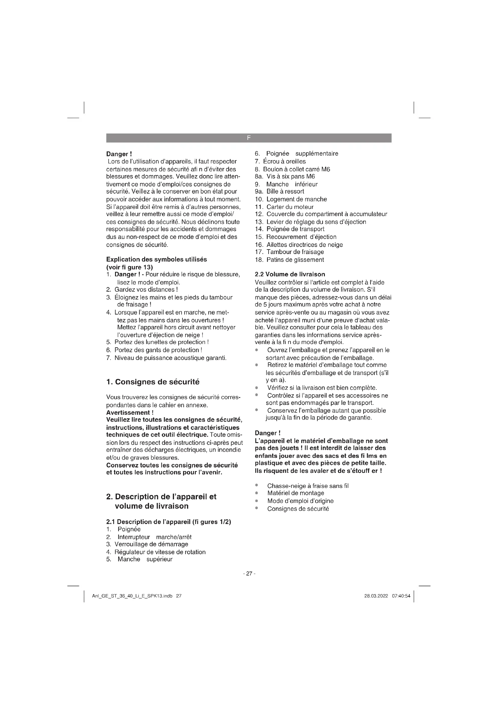 Dérangement Cause probable Élimination Le tambour de frai- sage ne tourne pas a) Accumulateur(s) vide(s) b) Accumulateur(s) trop froid(s) c) La neige trop haute empêche le démarrage d) Tambour de fraisage givré ou plein de neige e) Contact insuffi sant ou ab- sence de contact entre le manche et la fi xation du man- che (chapitre 5.1) a) Remplacer par un (des) accumulateur(s) pleins b) Remplacer par un (des) accumulateur(s) à température ambi- ante c) Soulever légèrement le tambour de frai- sage de la neige avant la mise en circuit d) Libérer précautionneusement le tam- bour de fraisage de la glace et de la nei- ge, le cas échéant le laisser dégeler e) Ouvrir le raccordement de manche, re- tirer le manche et contrôler les contacts. Refi xer le manche Le réglage des ai- lettes directrices de neige ne fonctionne pas (chapitre 6.4.1) a) Ailettes directrices de neige givrées ou pleines de neige a) Libérer précautionneusement les ailet- tes directrices de neige de la glace et de la neige, le cas échéant les laisser dégeler Anl_GE_ST_36_40_Li_E_SPK13.indb 33Anl_GE_ST_36_40_Li_E_SPK13.indb 33 28.03.2022 07:40:5528.03.2022 07:40:55F