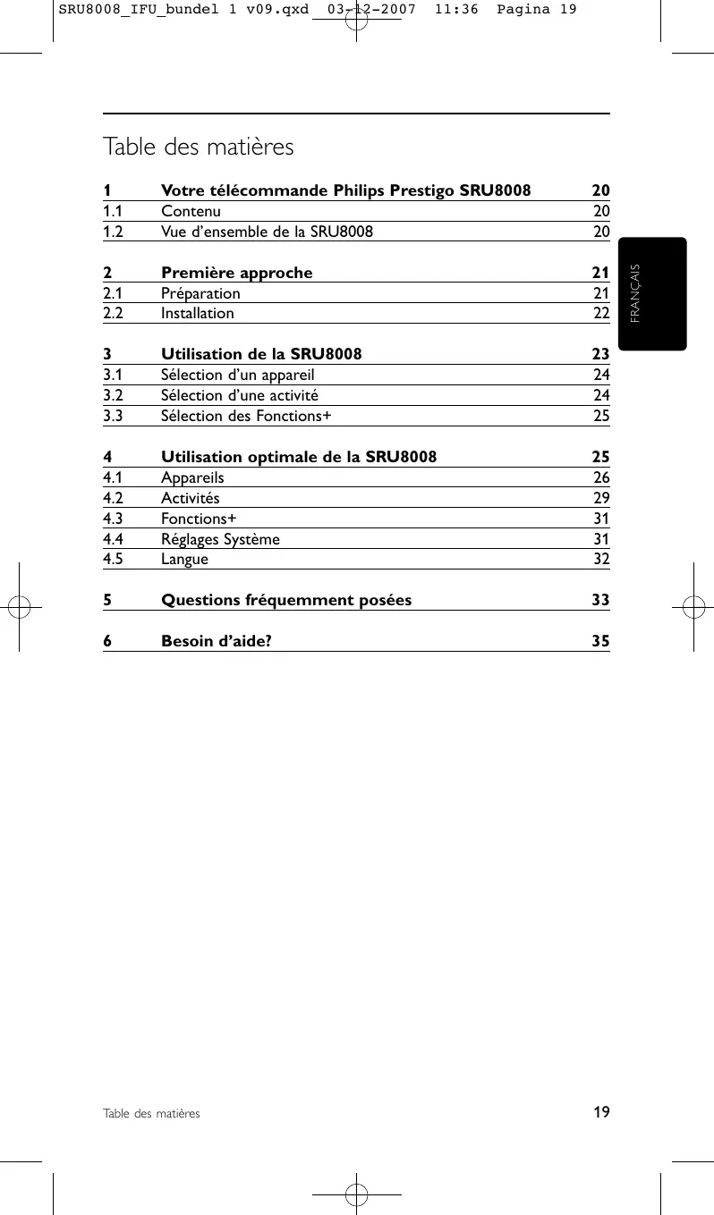 FRANÇAIS Table des matières Votre télécommande Philips Prestigo SRU8008 Bienvenue dans la famille toujours plus nombreuse des possesseurs de produits Philips. La télécommande universelle Philips Prestigo SRU8008 a été conçue pour contrôler votre équipement. Vous pouvez installer jusqu’à 8 appareils et 8 activités. Sélectionnez un appareil et faites-le fonctionner avec les touches de la SRU8008. Sélectionnez une activité et démarrez automatiquement une séquence de pressions de touches pour, par exemple, regarder un DVD ou écouter un CD. Sélectionnez plus de fonctions et attribuez davantage de fonctions avancées à votre télécommande.